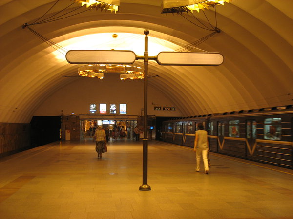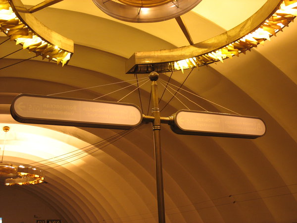 Может, столб и хорош, и как-то вписывается в архитектуру станции, в частности, ванты похожи на те, что на люстрах, но всё равно как-то... неуютно. Хотя, может быть, это лишь с непривычки, всё-таки получше троллейных столбов смотрится...