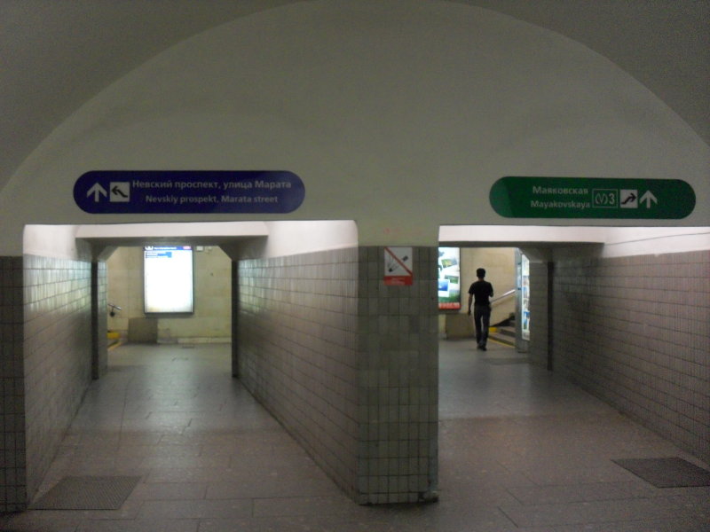 С сосисками любопытная история... Сосиски на Площади Востания установлены (в том числе и) в проходах между центральным и боковыми залами. Т.е., так, как и раньше располагались указатели, и так, как это сделано на Невском проспекте (в отличии от большинства станций, где сосиски размещены только поперёк ЦЗ). Это безусловно явление положительное. А вот конкретное воплощение любопытно... на южной половине станции (т.е. у головных вагонов в сторону Владимирской и у хвостовых в сторону Чернышевской) указание на М3 идёт не на эскалаторный переход, а на лестничный. Интересно, это очередной косяк НИПменов или продуманная концепция, с целью снизить поток по пересадочным эскалаторам? Раньше тенданция была обратная: загнать на эскалаторы максимум народа,пересаживающегося с Площади Восстания на Маяковскую (а в лестничный переход пустить поток с Маяковской на Площадь Восстания).