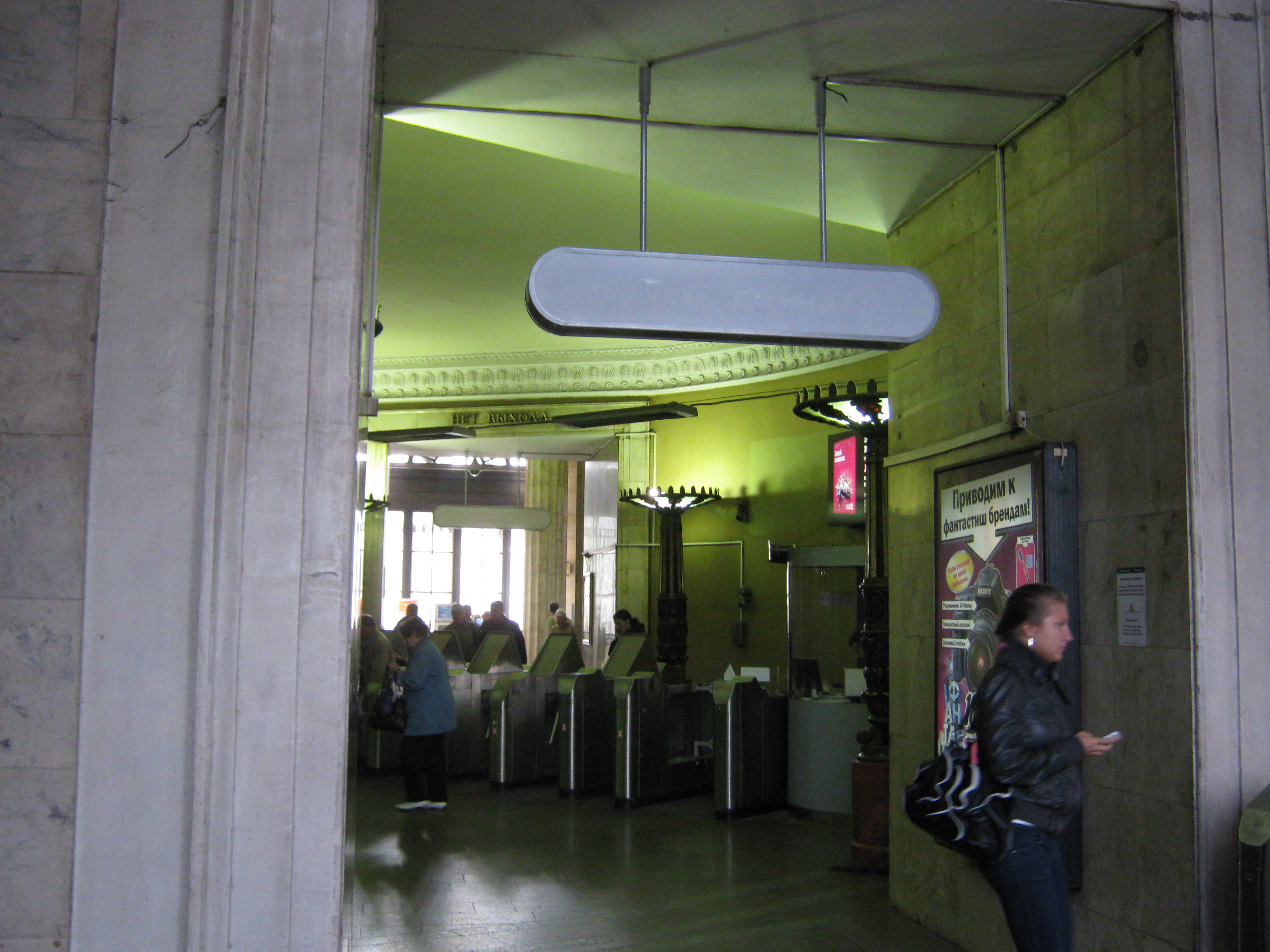 Тут самое дурное - это даже не полосы на стенах, а инфостенд прямо посреди. Хоть он и плоский, но перспектива станции сильно страдает. Ильича заслонили, да и красивейший гранитный пол, ранее свободный от всего, теперь нарушен.