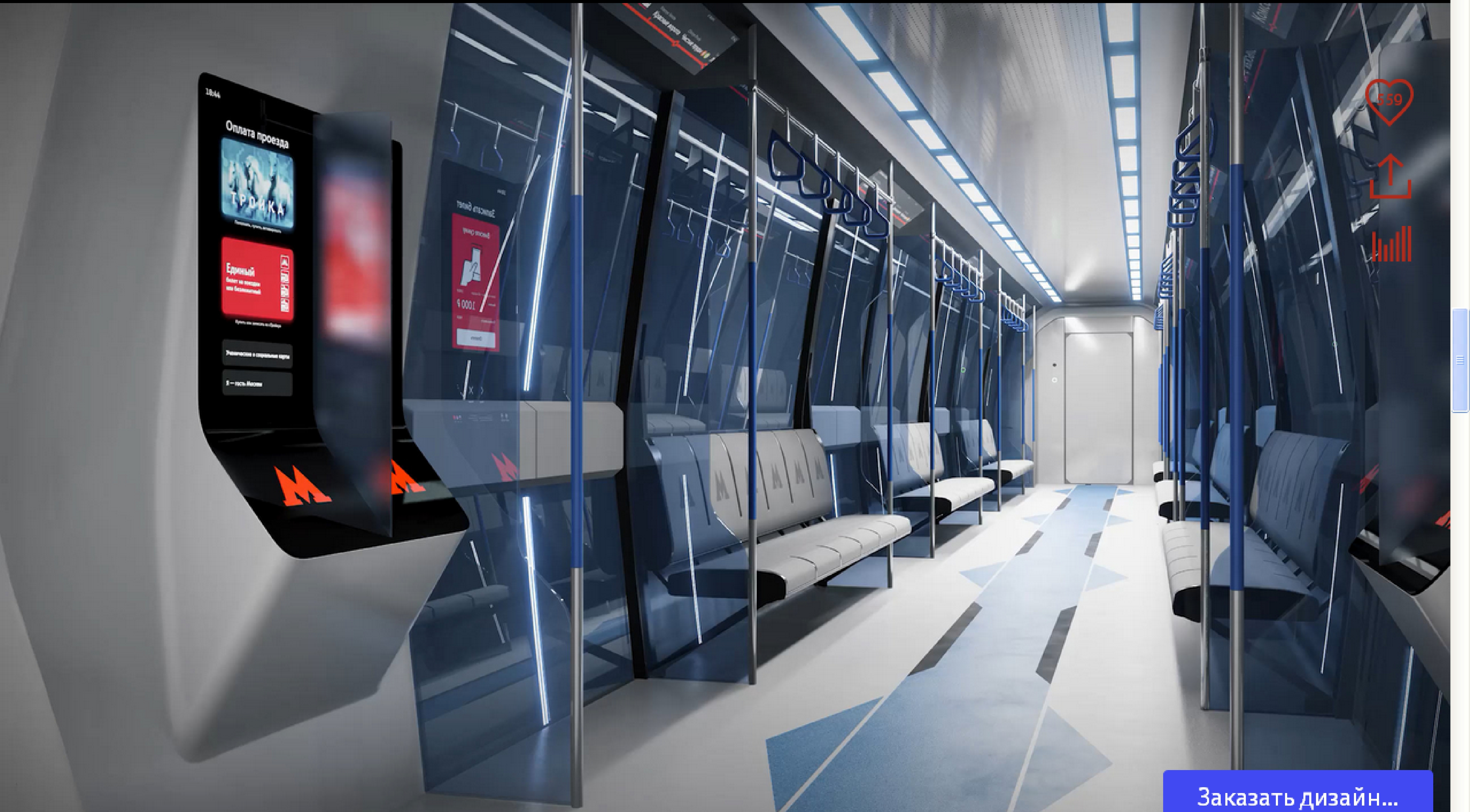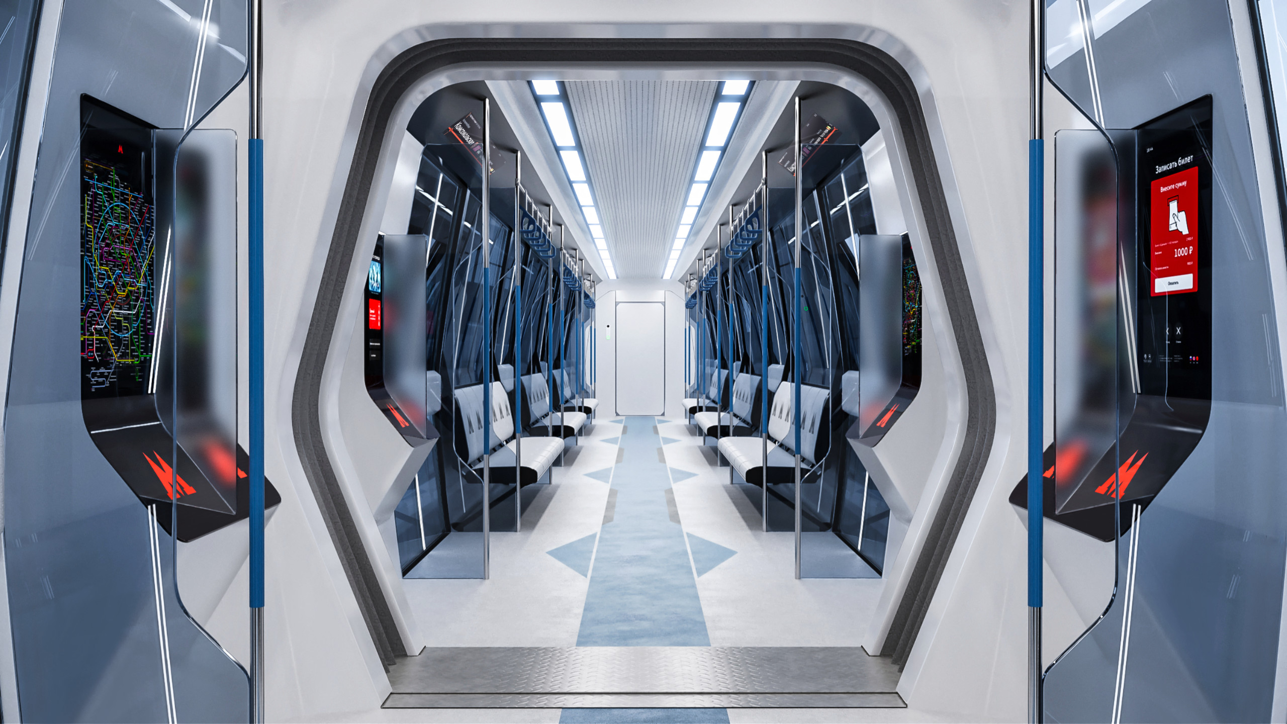 Какие-то странные впечатления от этих рендеров. Во-первых: нижняя часть рендера там где стоят два вагона — как будто от другого вагона вообще. Не видно, как будет выглядеть вагон в профиль, да и в целом экстерьер выглядит как-то смазано, темно и с большим количеством бликов, как будто его не очень-то и хотели показывать. Все эти световые полосы, особенно RGB — скорее бы в них наигрались. Очень много стекла, зачем — если вагон ездит в тоннеле, чтобы пассажиры наслаждались видами кабелей и пыльных тюбингов?