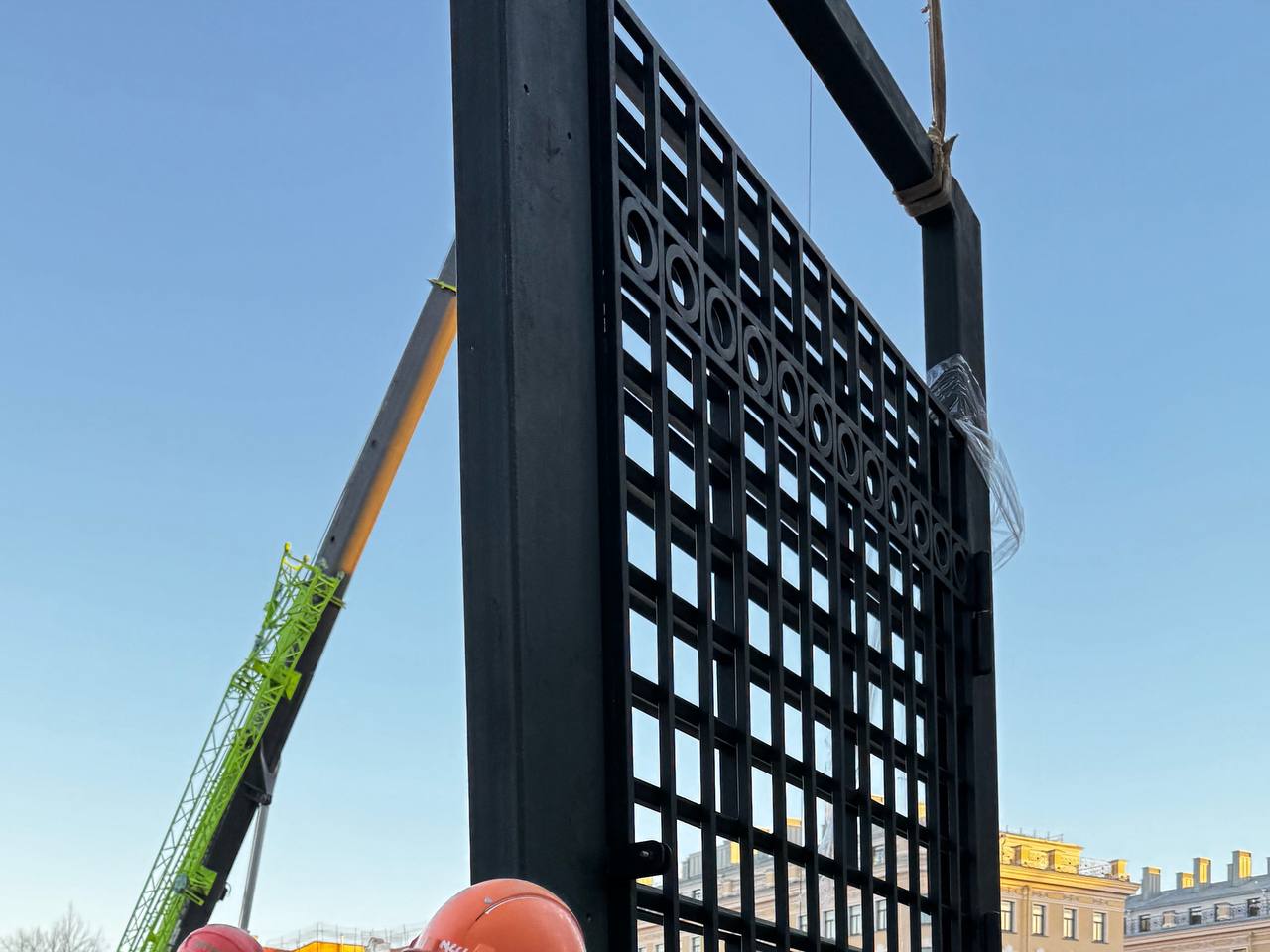 Начинается монтаж вентиляционного киоска из металлических решёток, которые придадут этому сооружению узнаваемый вид.