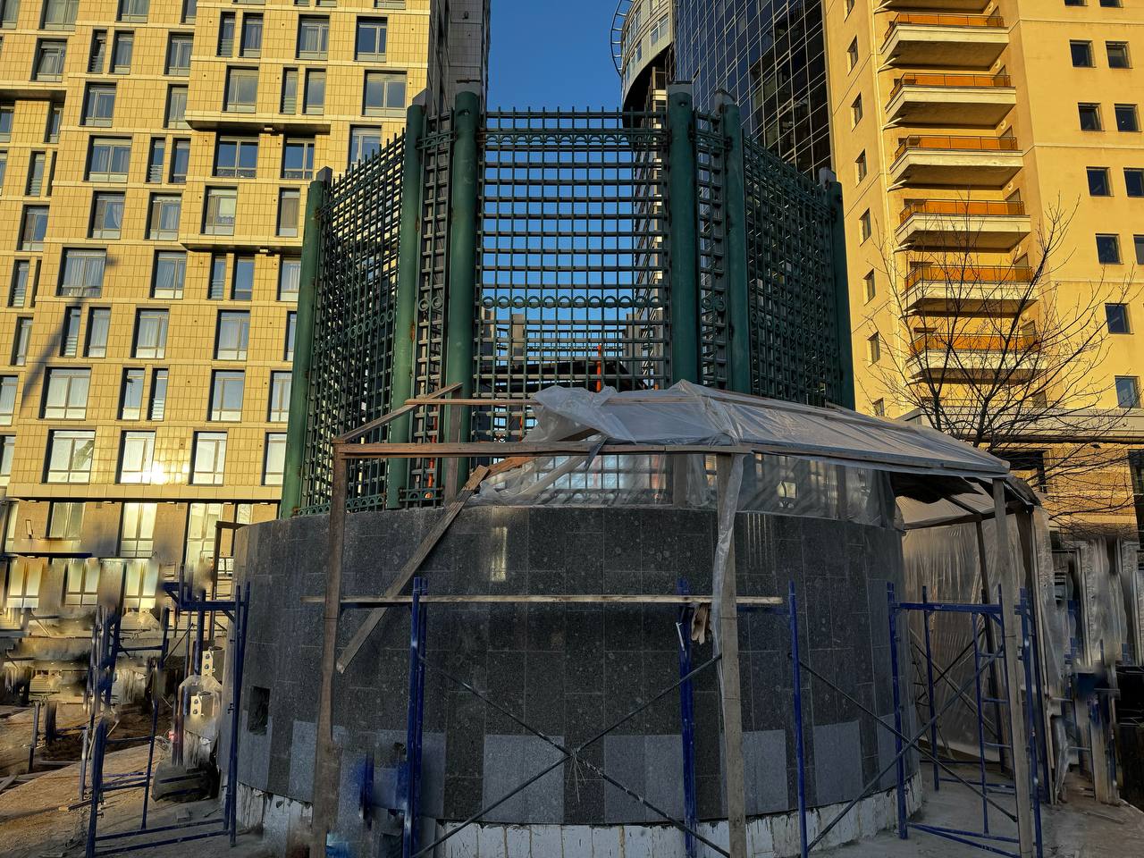 На данный момент установлена решётка и выполнена облицовка цоколя вентиляционной шахты.