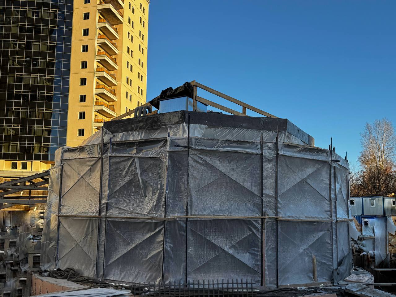 Завершены монолитные работы: возведены основные конструкции эвакуационного выхода, а также основание вентиляционного киоска шахты, идут работы по гидроизоляции. Выполнена обратная засыпка котлована.