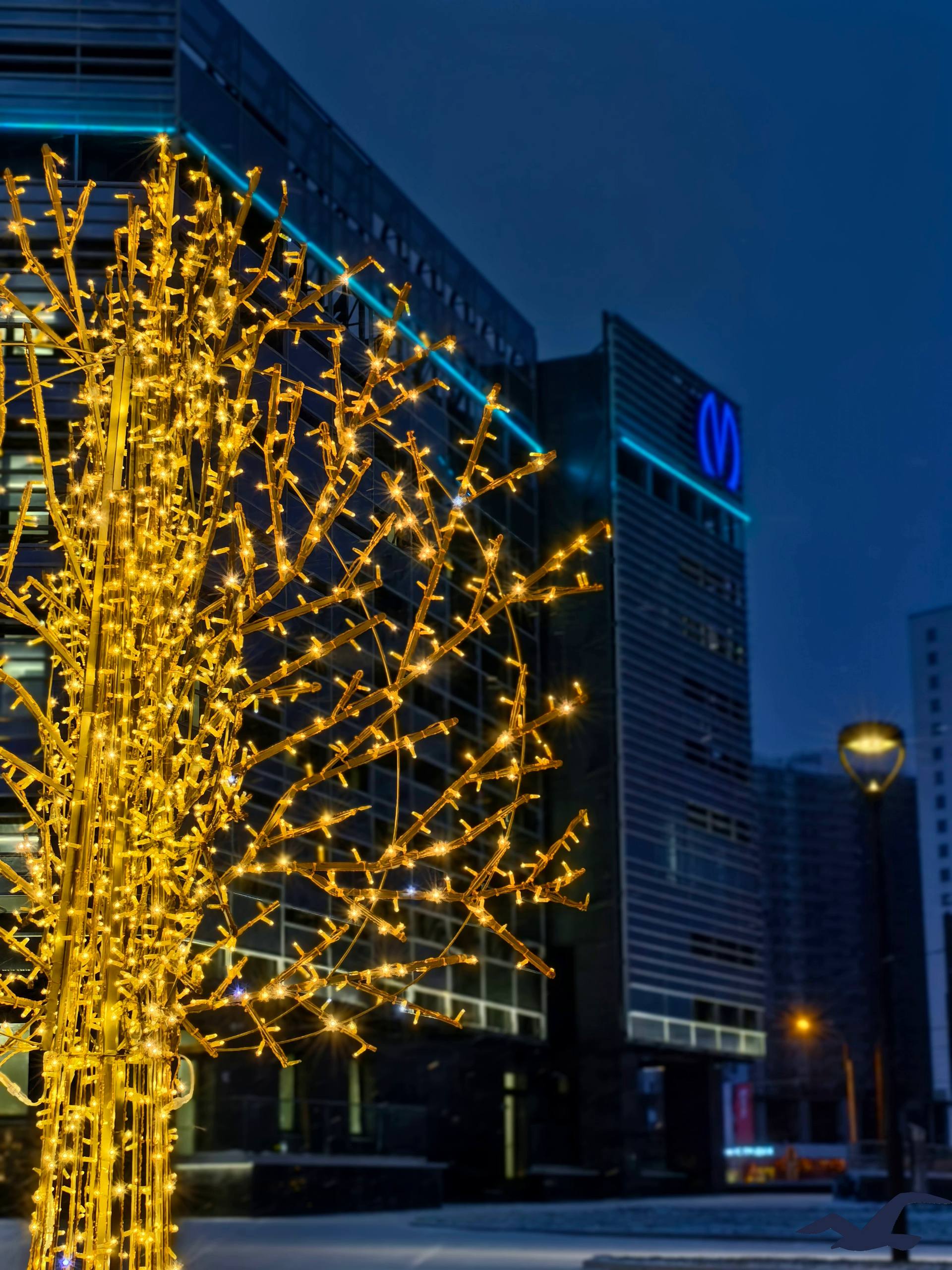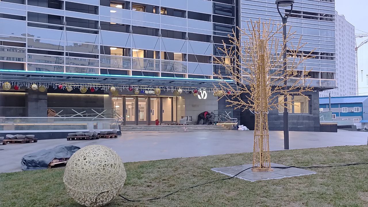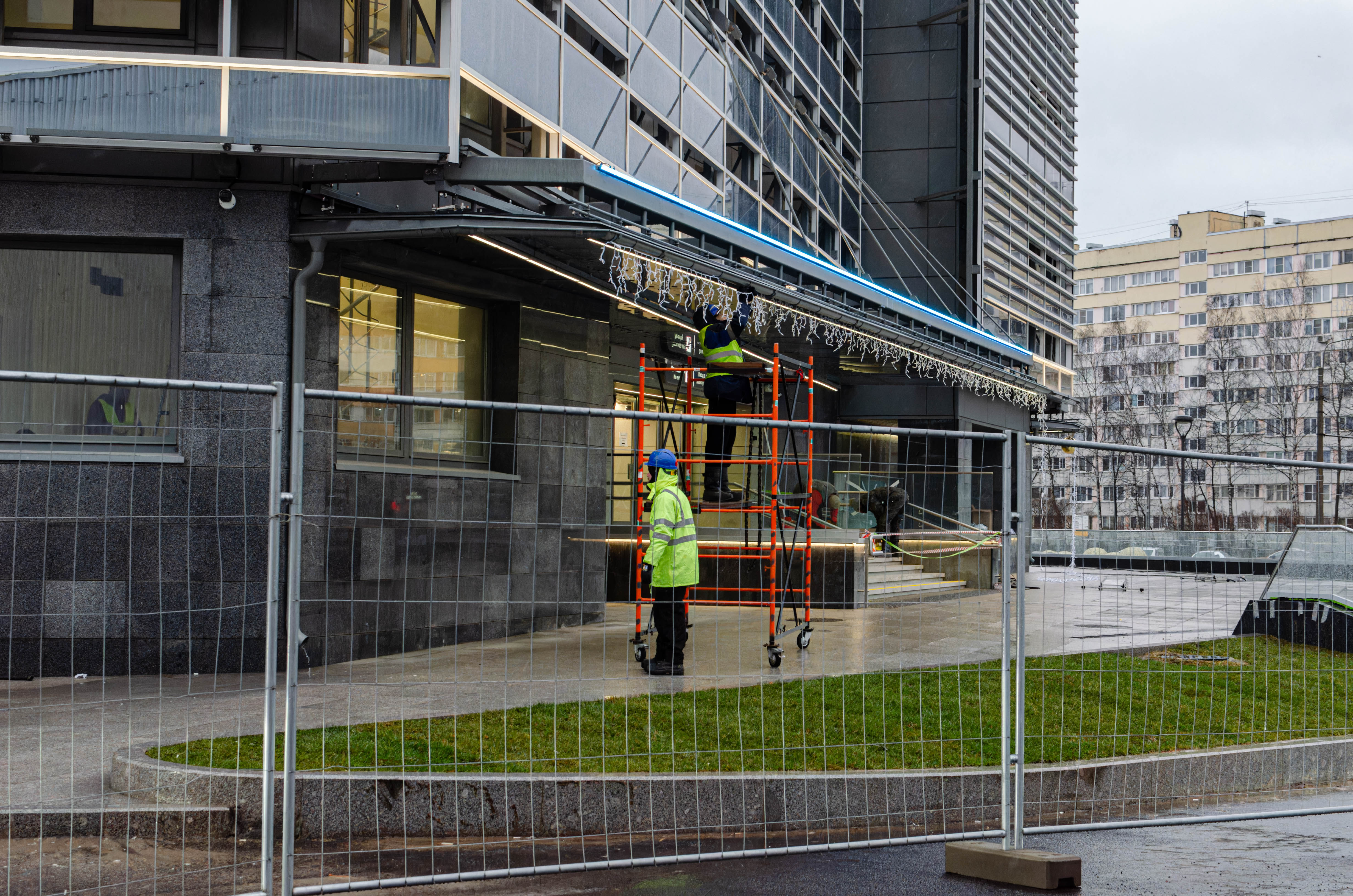 Новогодние украшения на благоустроенной территории у вестибюля станции метро «Юго-Западная».