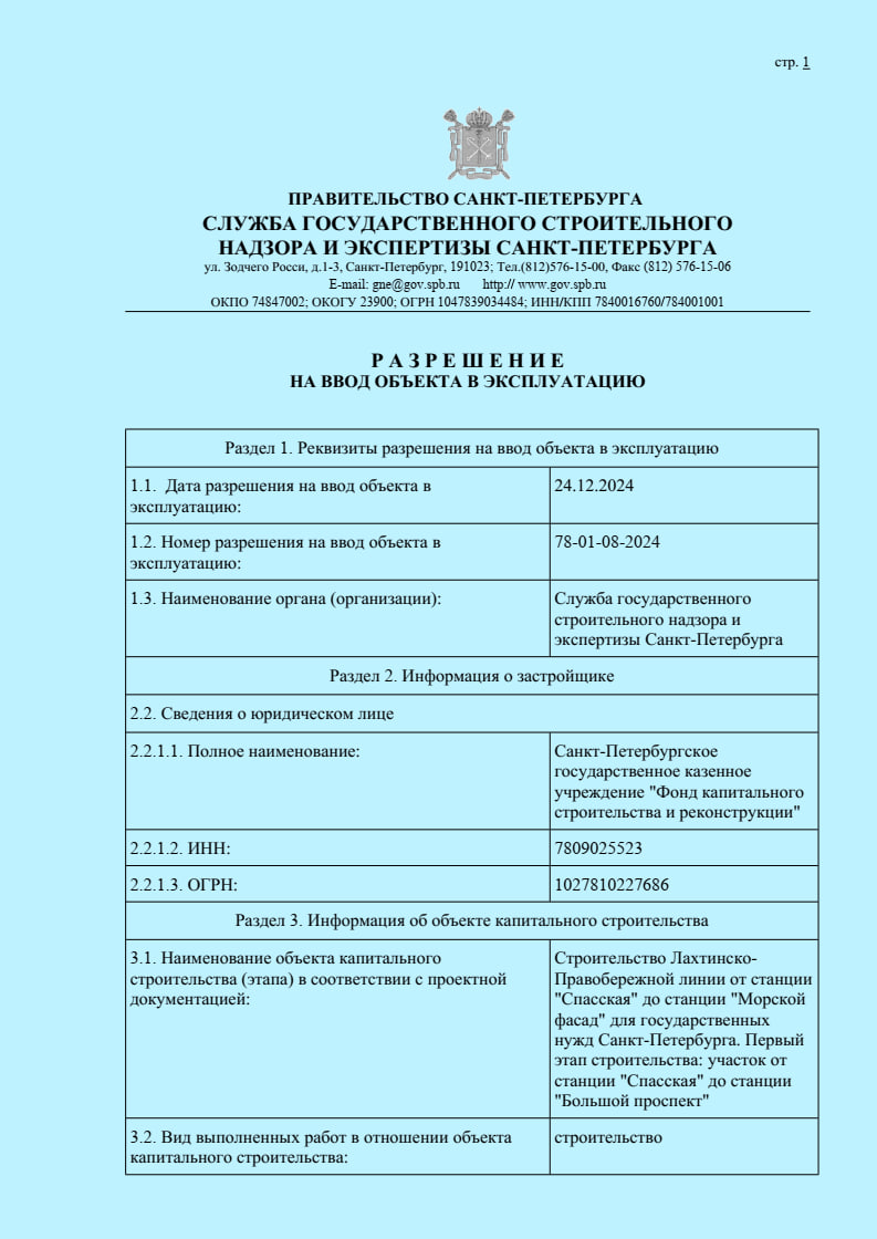 Пусковой участок Лахтинско-Правобережной линии, ст. "Горный институт", ст. "Театральная" (включая вентиляционные шахты и эвакуационные выходы) получили 24 декабря разрешение на ввод в эксплуатацию.