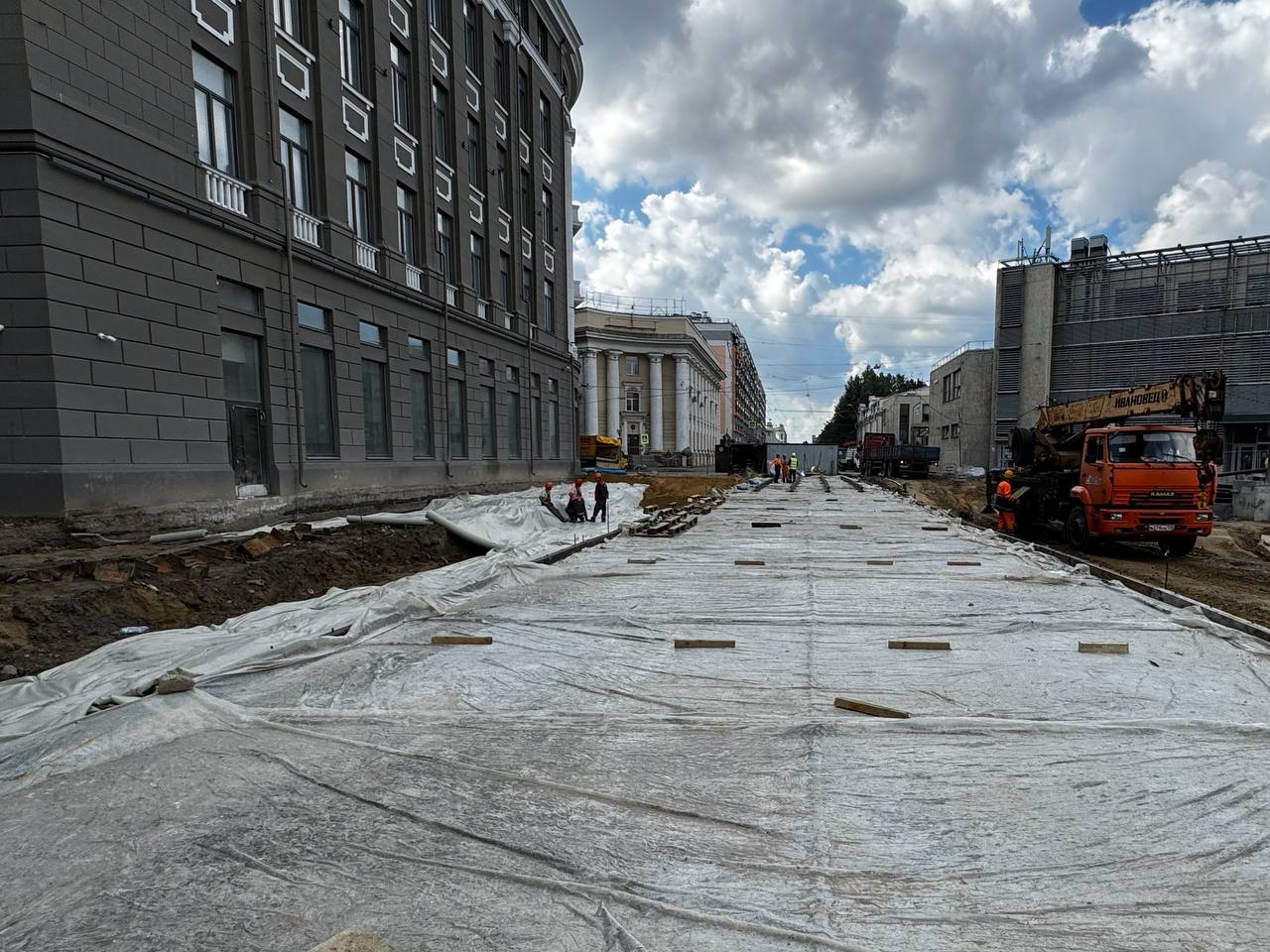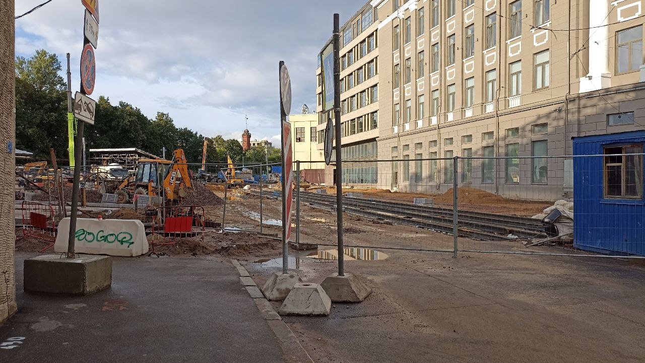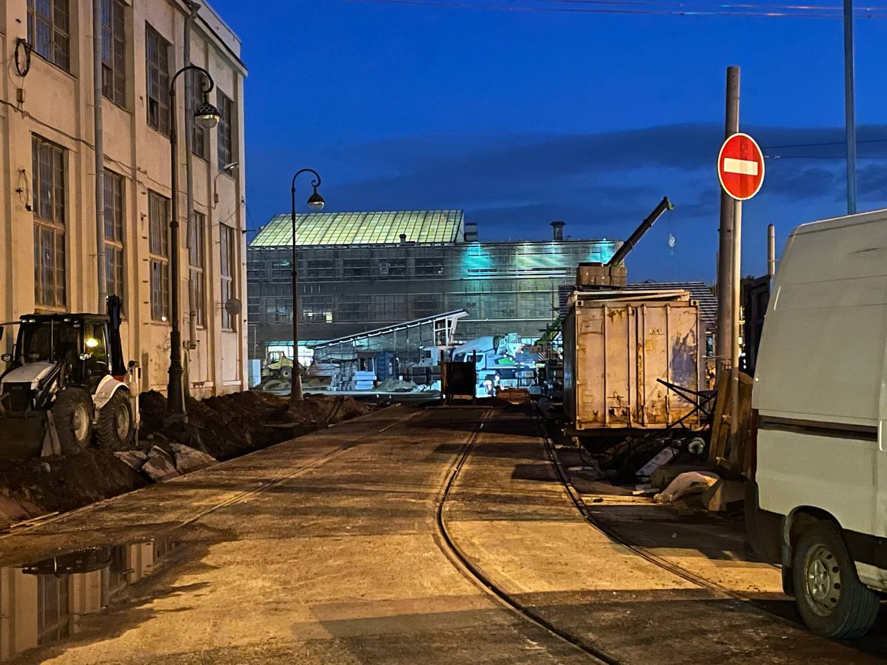 На Васильевском острове Санкт-Петербурга, вблизи строящегося вестибюля станции «Горный институт» Лахтинско-Правобережной (четвёртой, оранжевой) линии Петербургского метрополитена, идут работы по восстановлению трамвайного пути вдоль Косой линии.