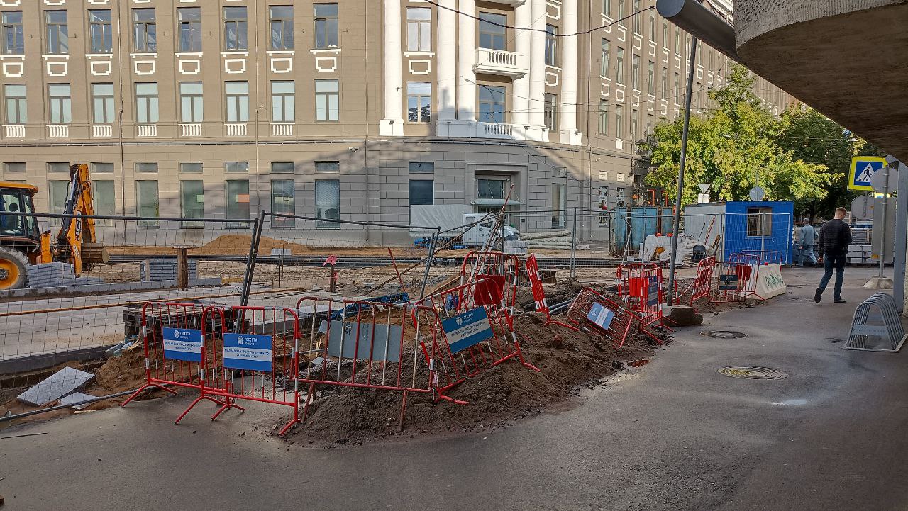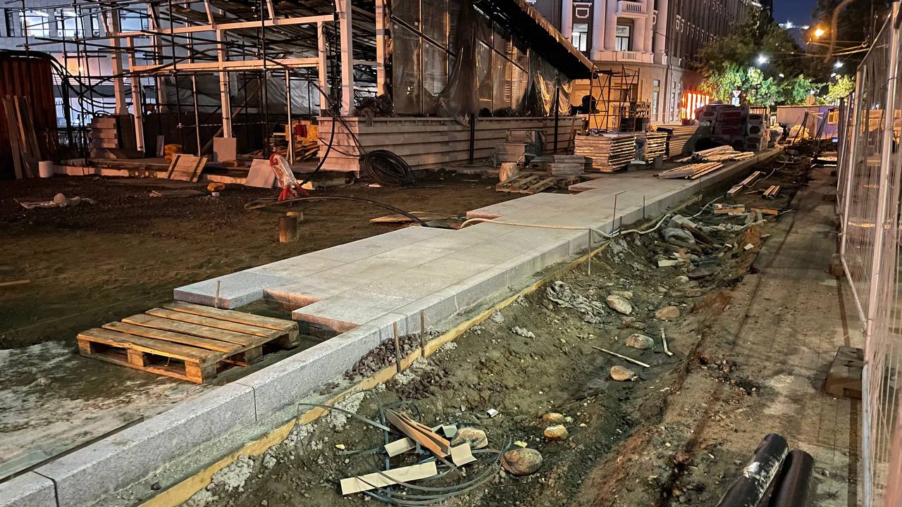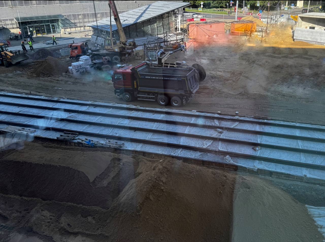 На Васильевском острове Санкт-Петербурга, вблизи строящегося вестибюля станции «Горный институт» Лахтинско-Правобережной (четвёртой, оранжевой) линии Петербургского метрополитена, идут работы по восстановлению трамвайного пути вдоль Косой линии.