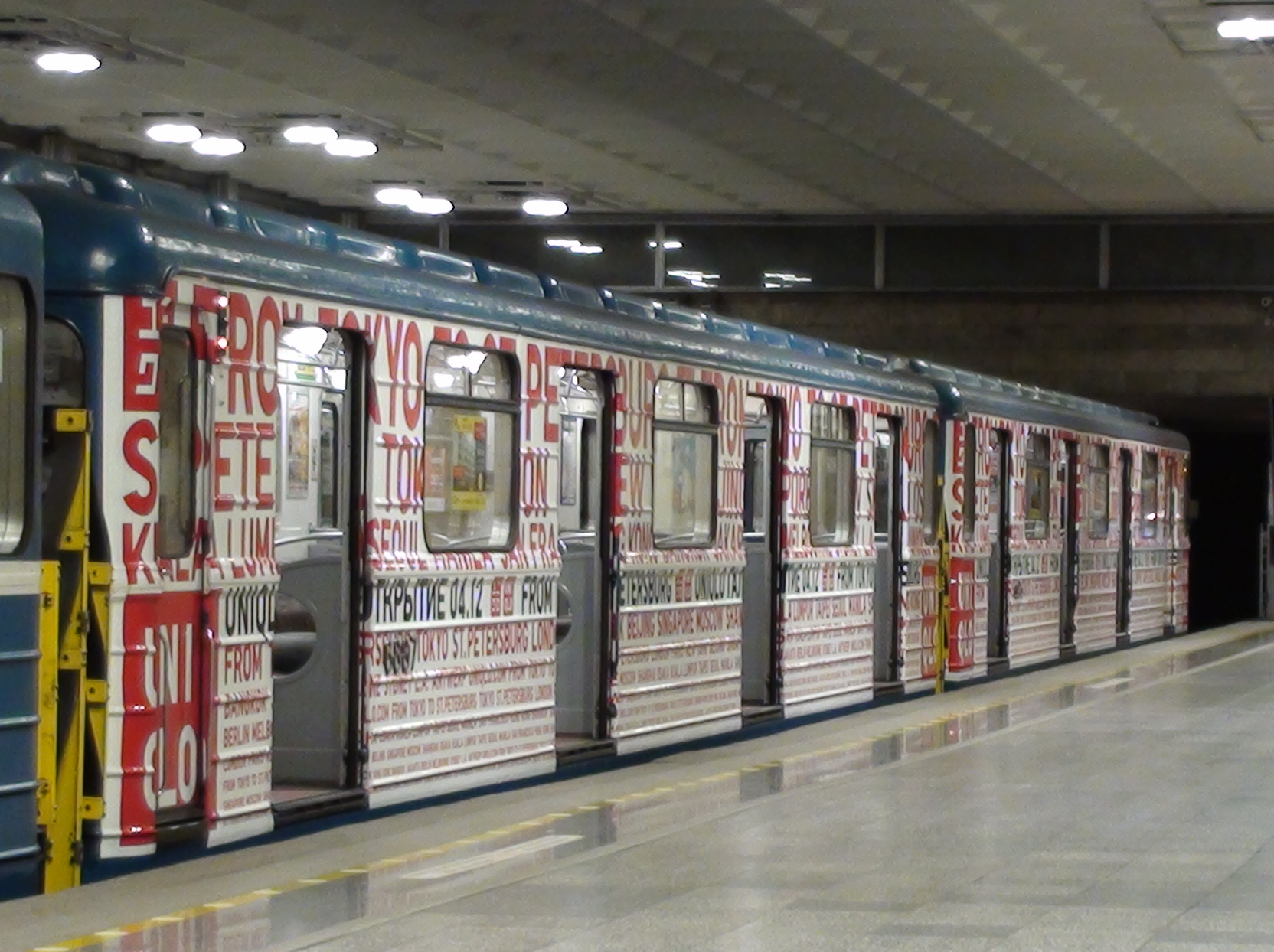 Внутри он обычный, зато снаружи все 8 вагонов оклеены голубой пленкой с историческими и стилизованными под старину фотографиями.