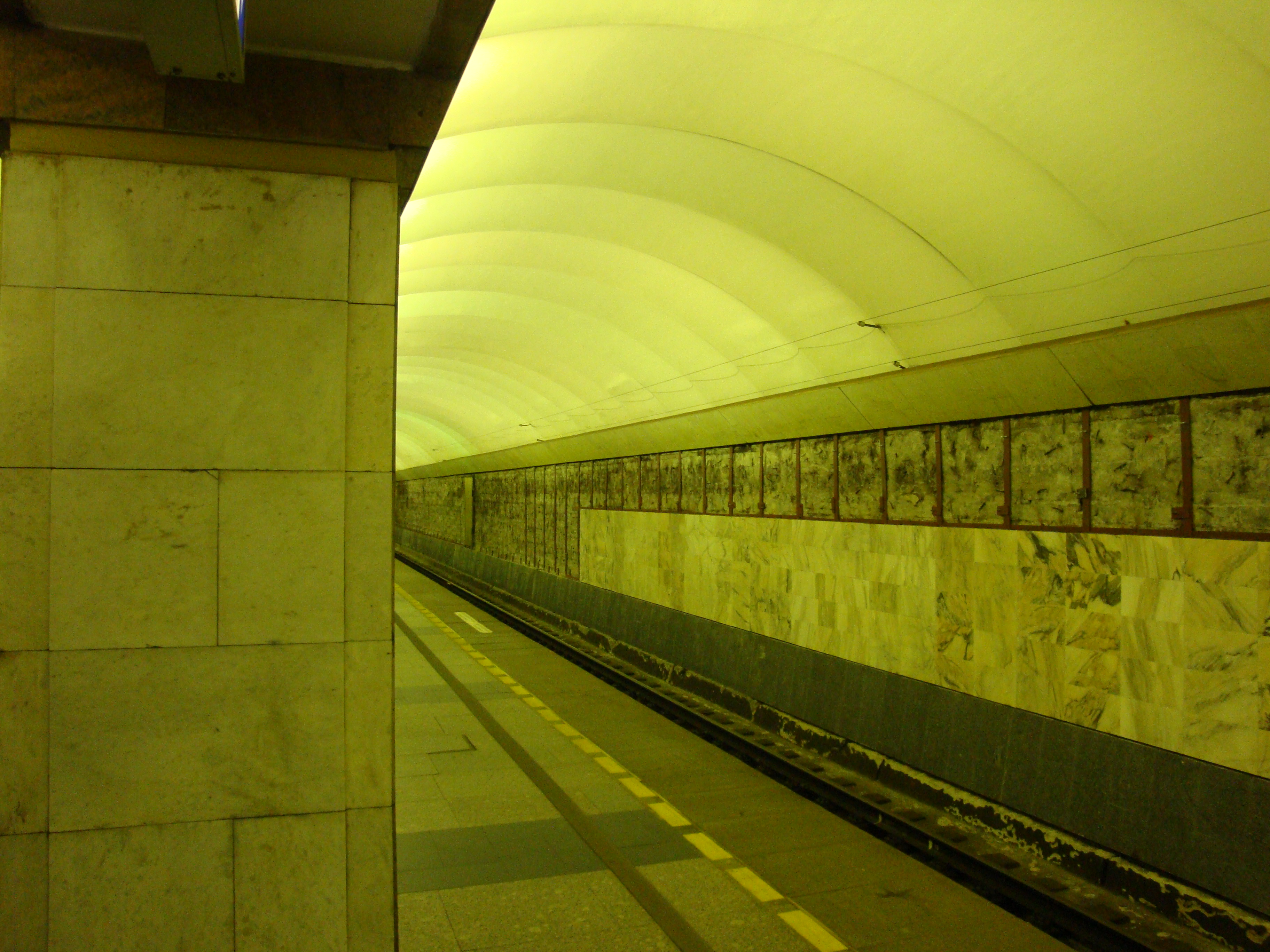 Что-то про пролетарскую никто новостей не выкладывает. А там уже облицовку по средней части стены доделали, и по верхней части — уже больше половины закончили. Теперь на уровне, где было название станции мрамор более светлого оттенка. Неприятно, что граница блоков не заделана, похоже по ней будут клеить изоленту. Но судя по тому, что по верху стены идёт более светлая полоса, красные буквы скорее всего вернут.