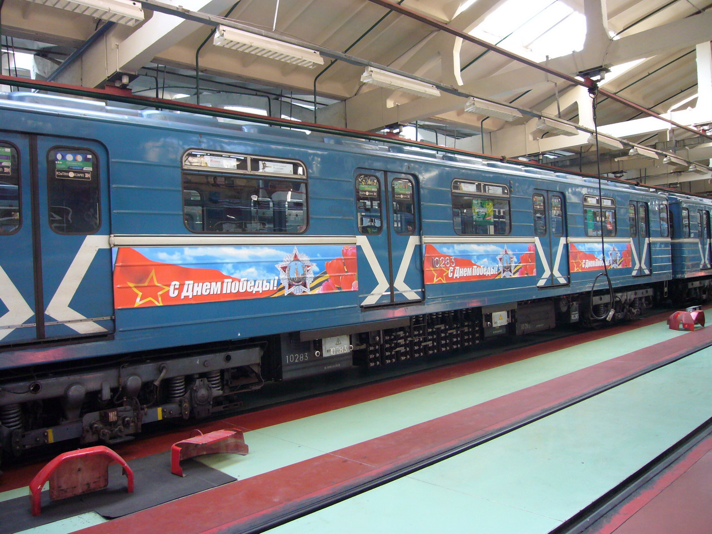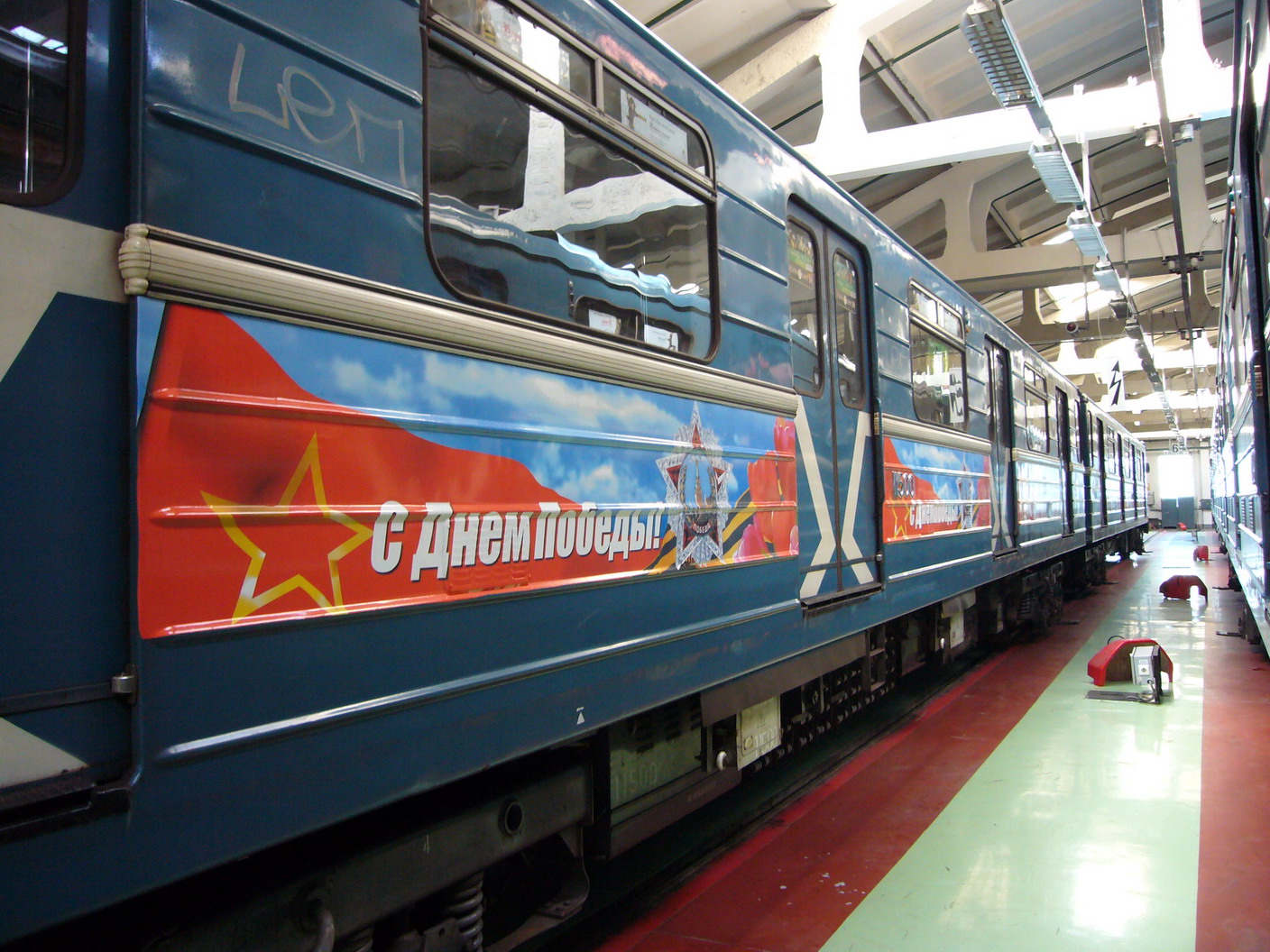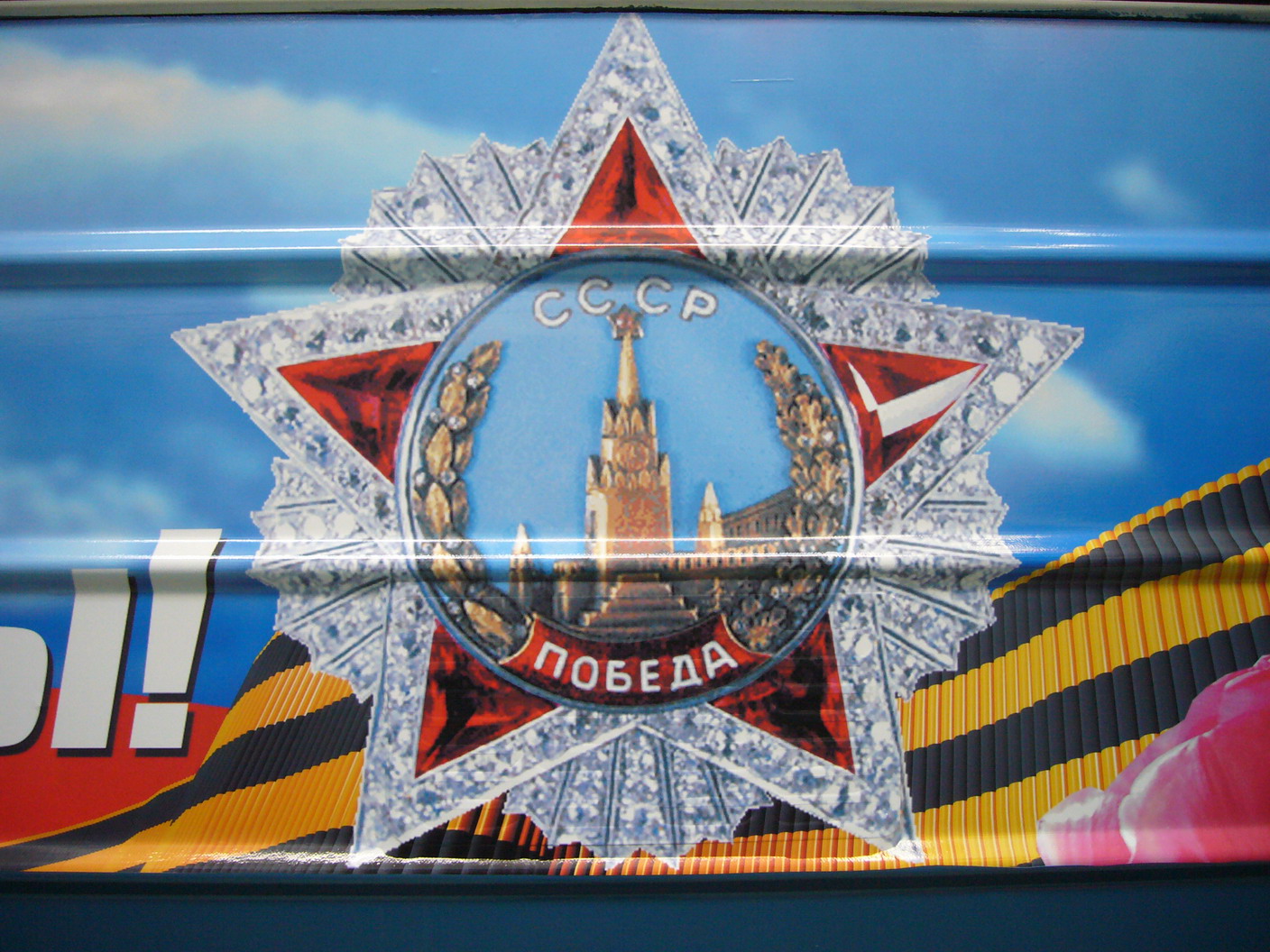 К 9 мая, в метрополитене появилась реклама с поздравлениями. Помимо привычных наклеек в вагоне, оклеены и борта.
