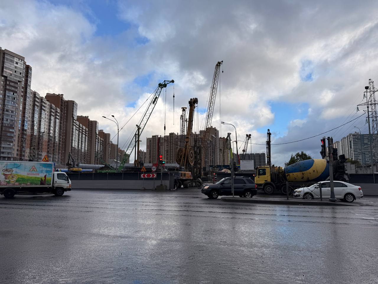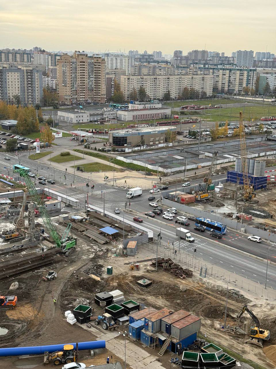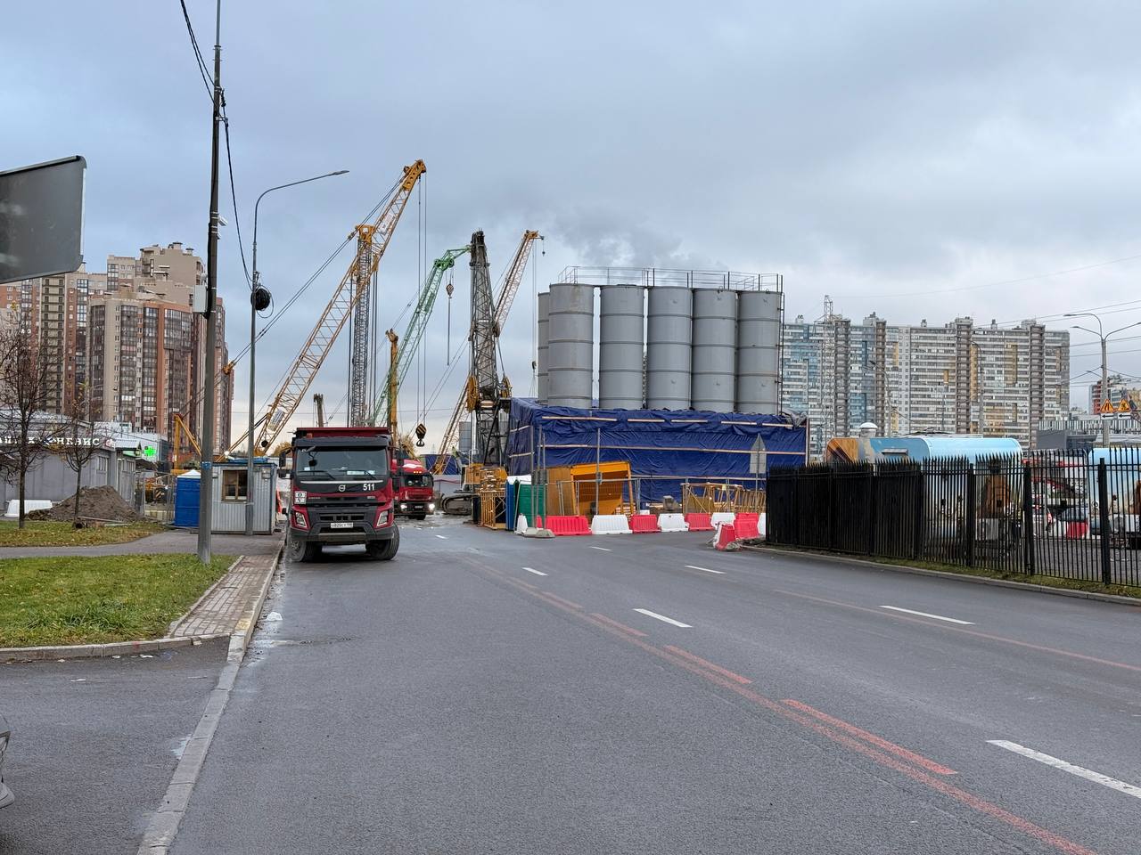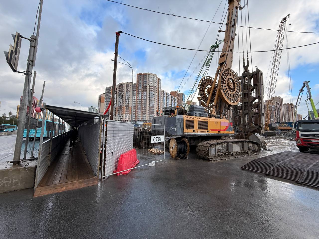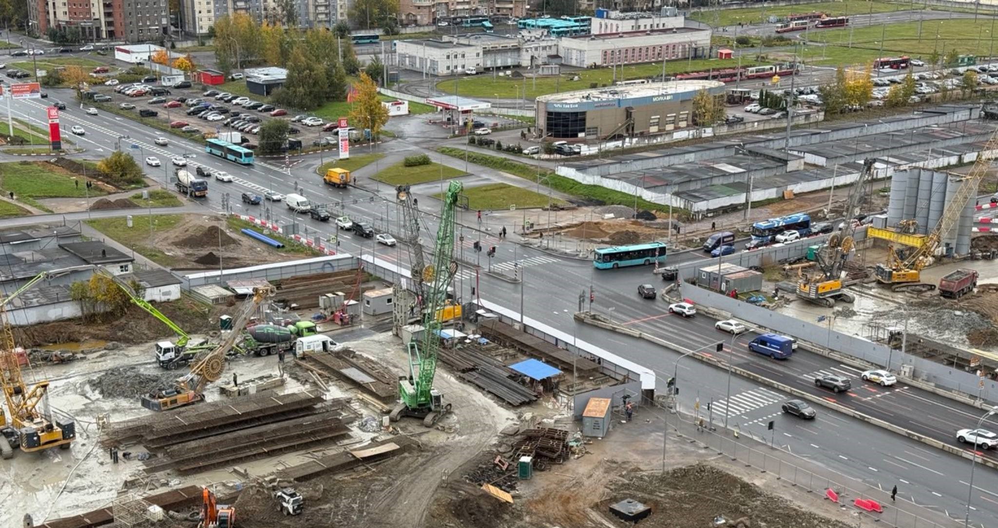 Вдоль Комендантского проспекта установлено временное ограждение из профлиста, а также оборудована крытая пешеходная галерея. Продолжаются работы по понижению уровня строительной площадки на участке от перекрёстка до подъездной дороги к гипермаркету «Лента».