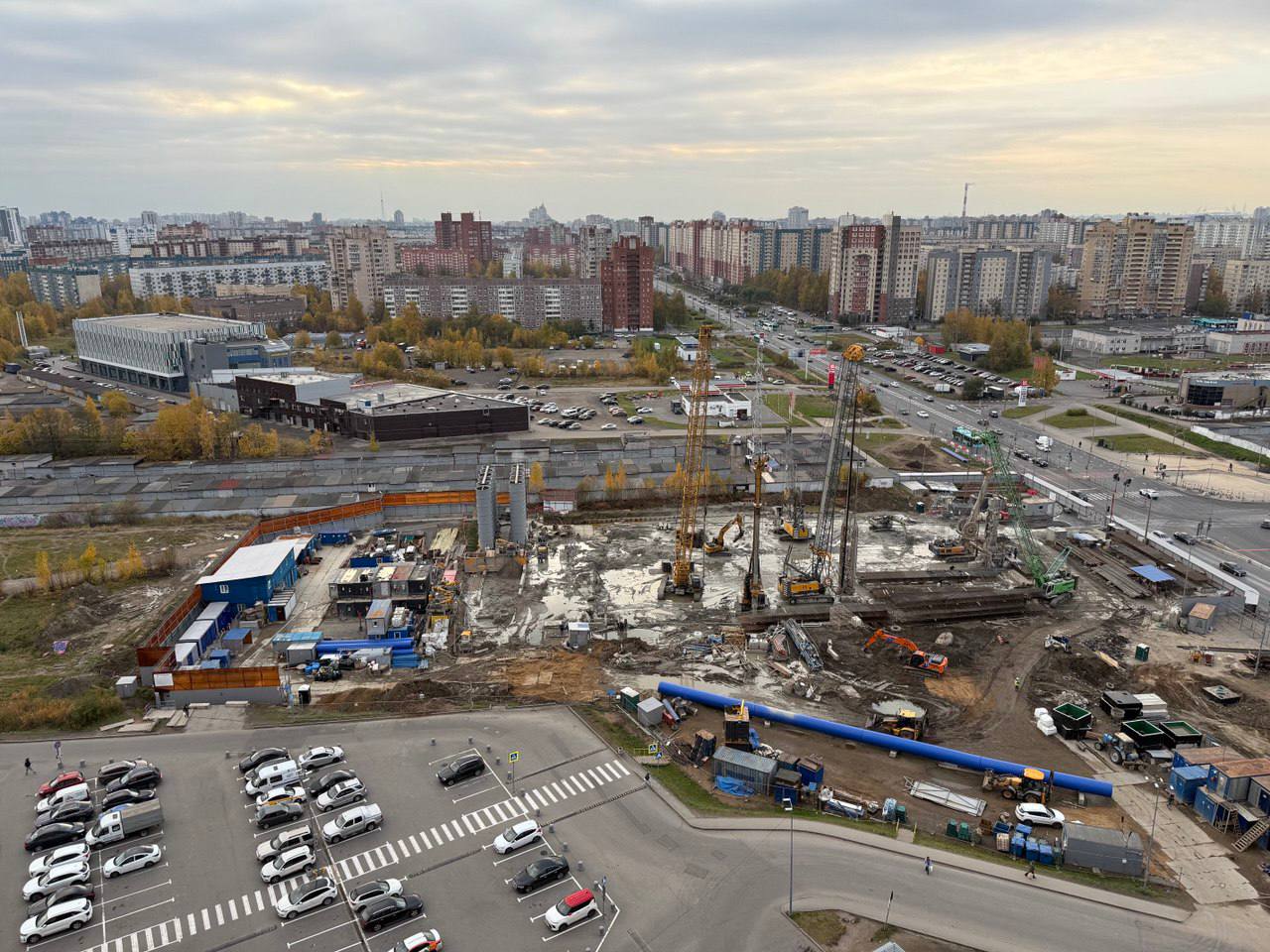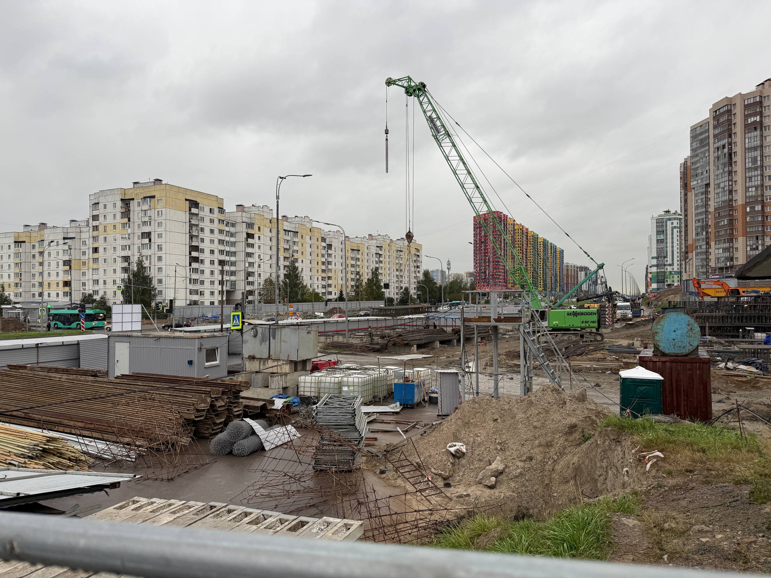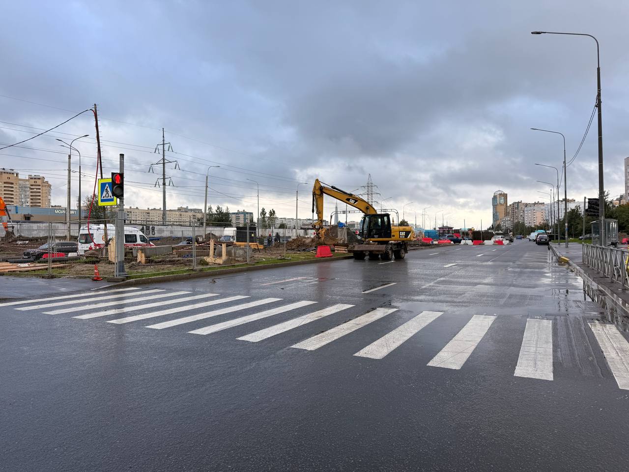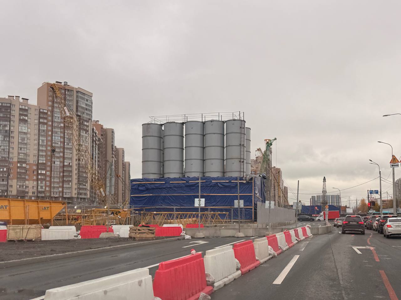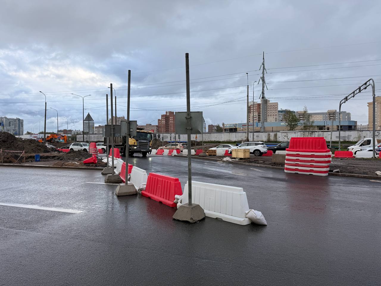 Вдоль Комендантского проспекта установлено временное ограждение из профлиста, а также оборудована крытая пешеходная галерея. Продолжаются работы по понижению уровня строительной площадки на участке от перекрёстка до подъездной дороги к гипермаркету «Лента».