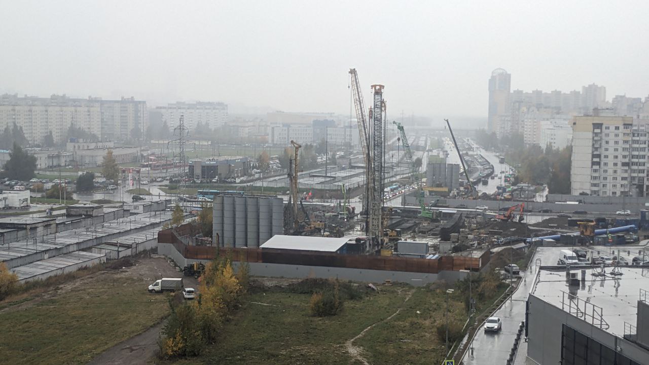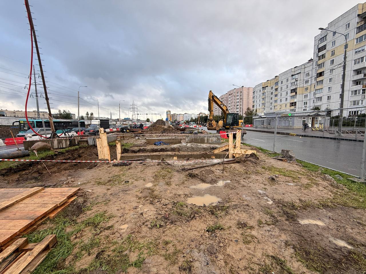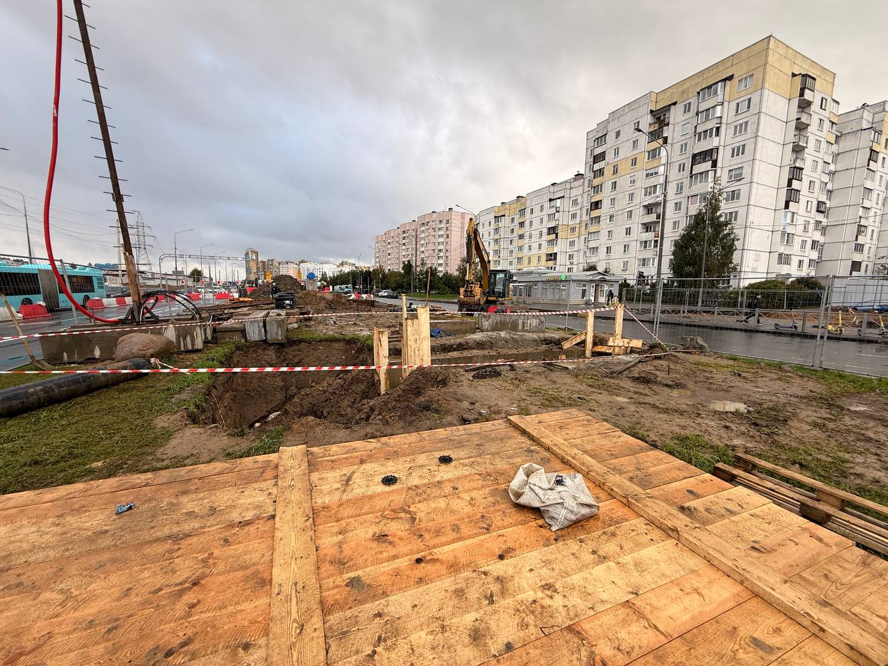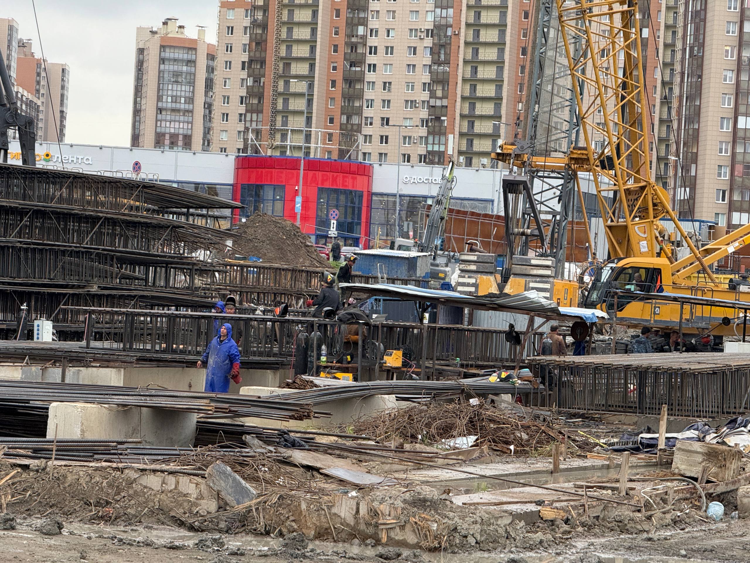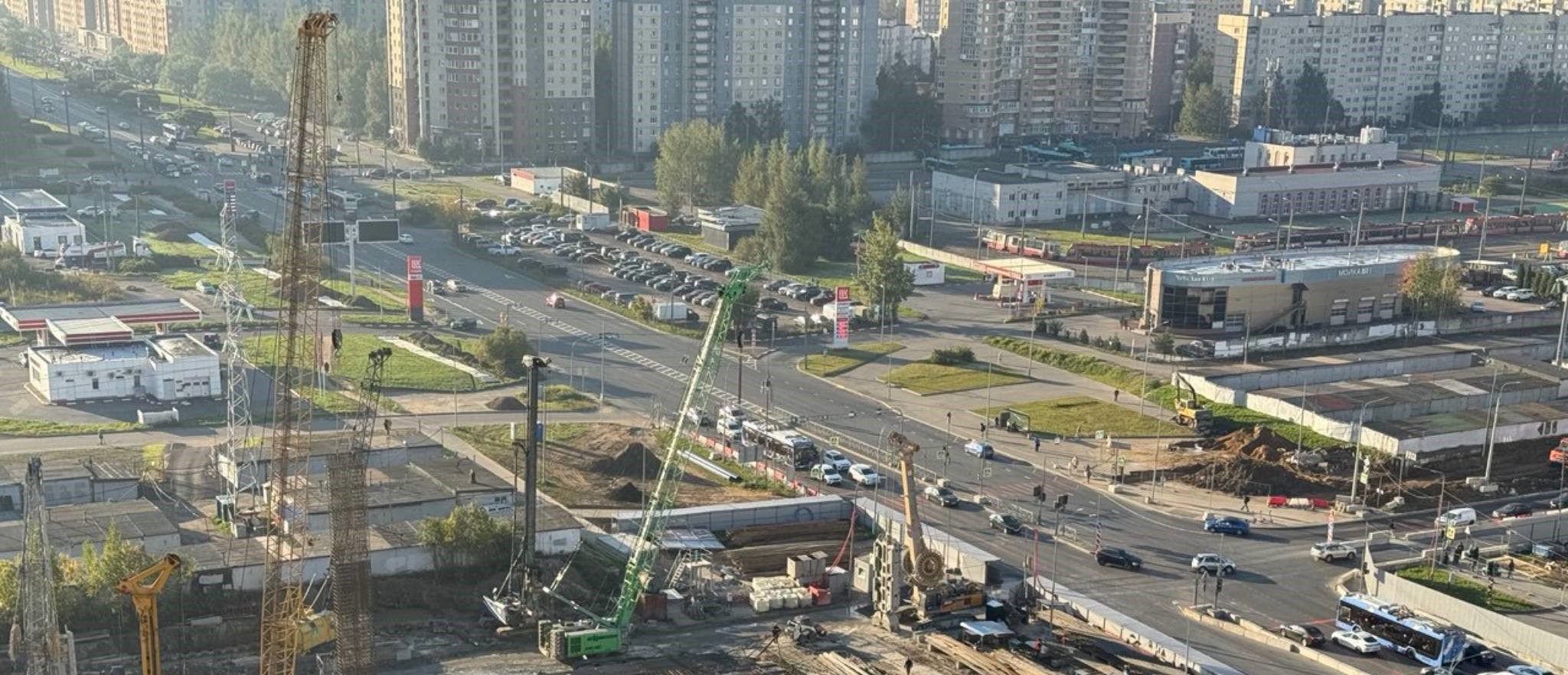 Вдоль Комендантского проспекта установлено временное ограждение из профлиста, а также оборудована крытая пешеходная галерея. Продолжаются работы по понижению уровня строительной площадки на участке от перекрёстка до подъездной дороги к гипермаркету «Лента».