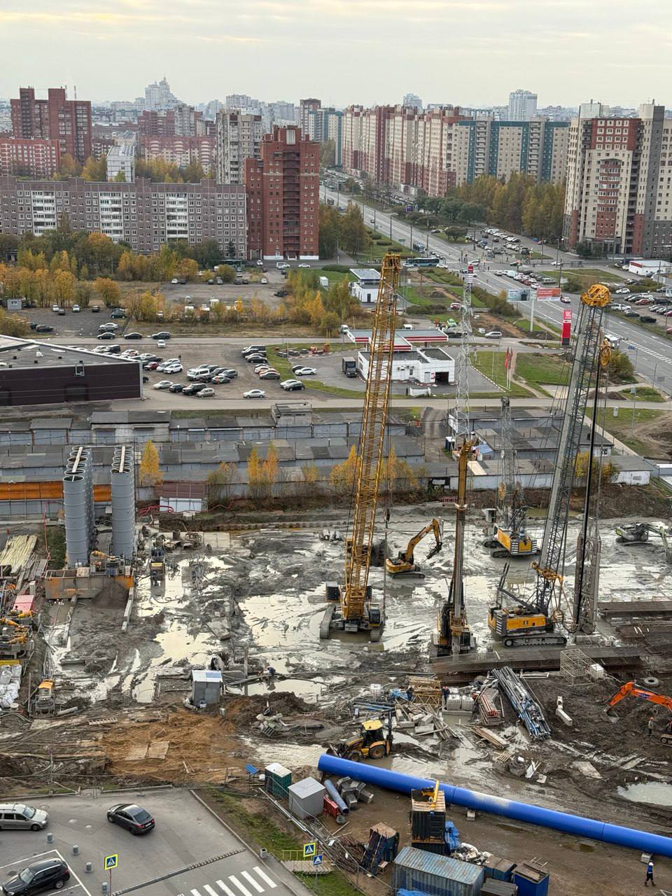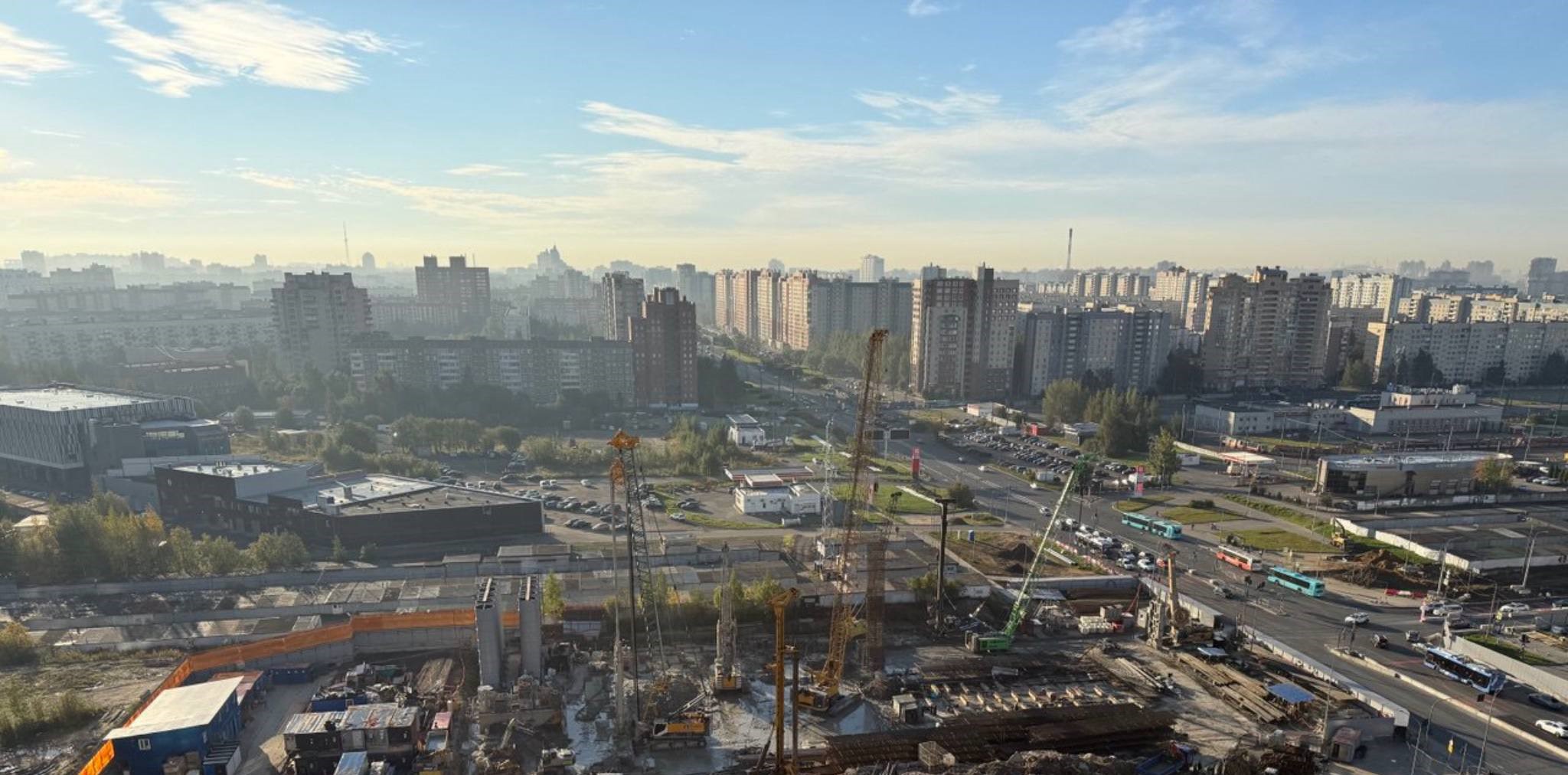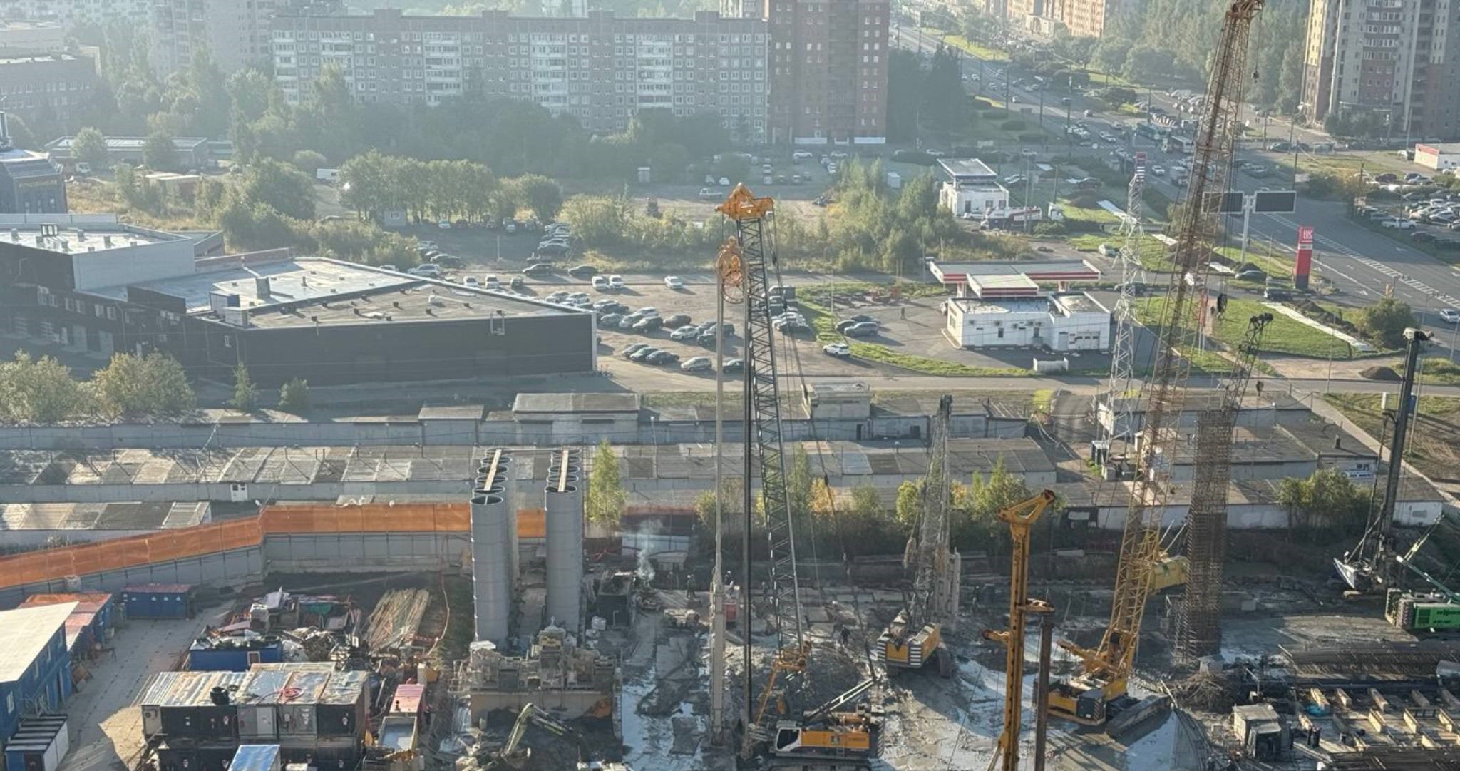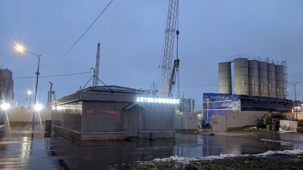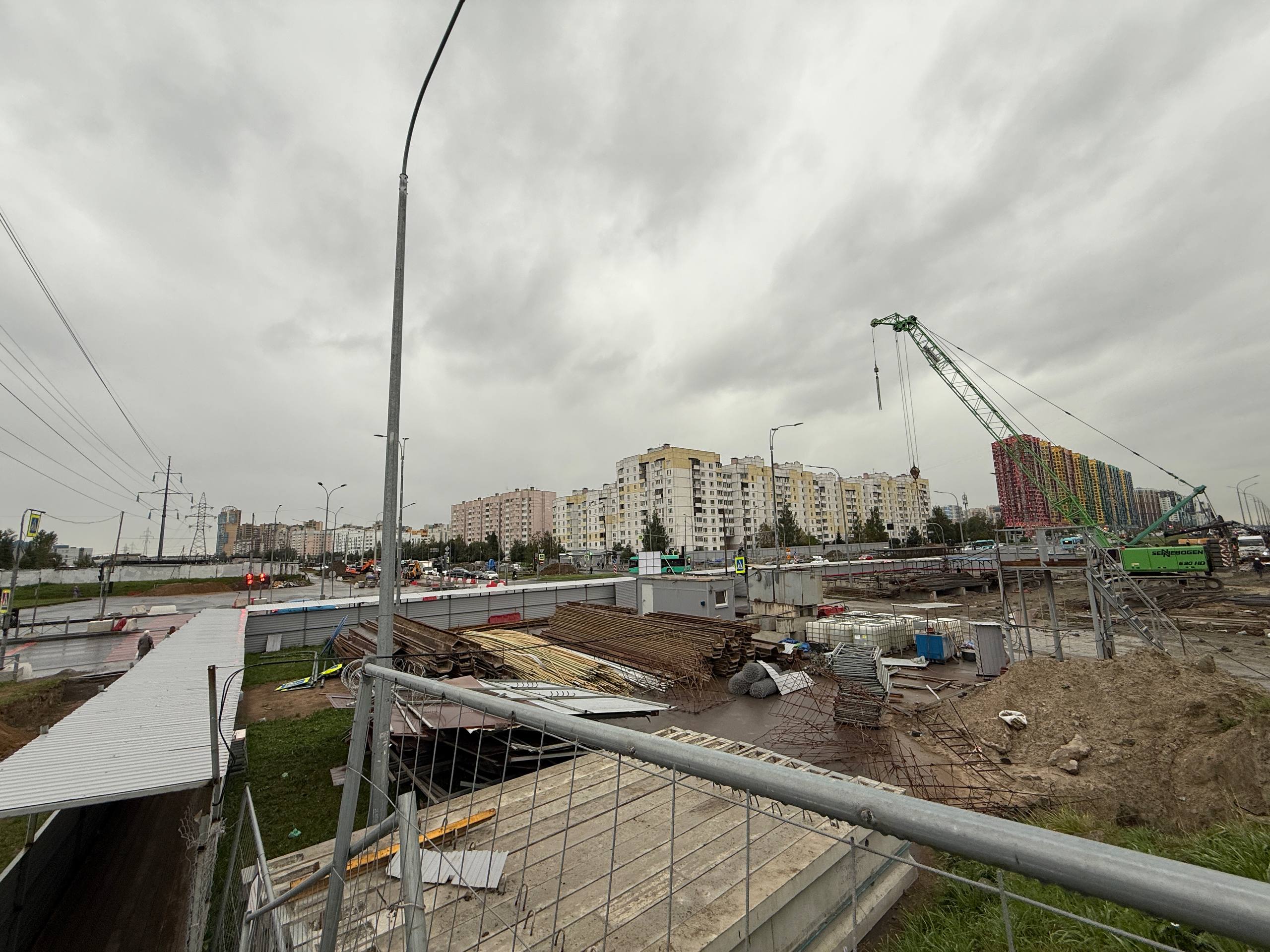 Вдоль Комендантского проспекта установлено временное ограждение из профлиста, а также оборудована крытая пешеходная галерея. Продолжаются работы по понижению уровня строительной площадки на участке от перекрёстка до подъездной дороги к гипермаркету «Лента».