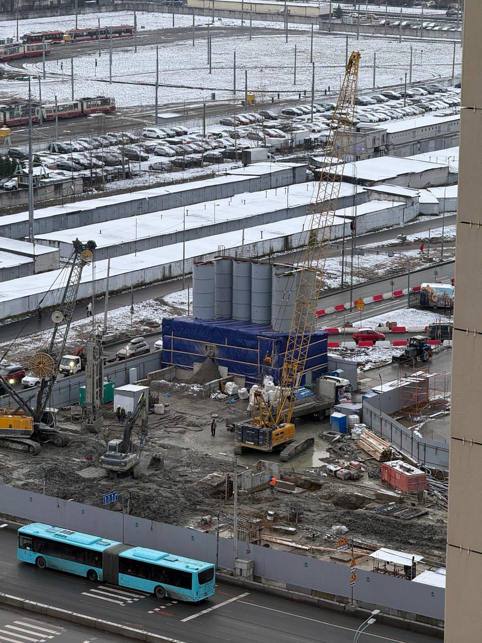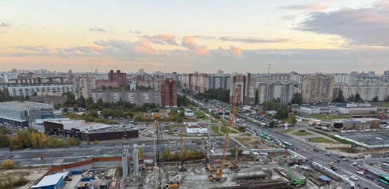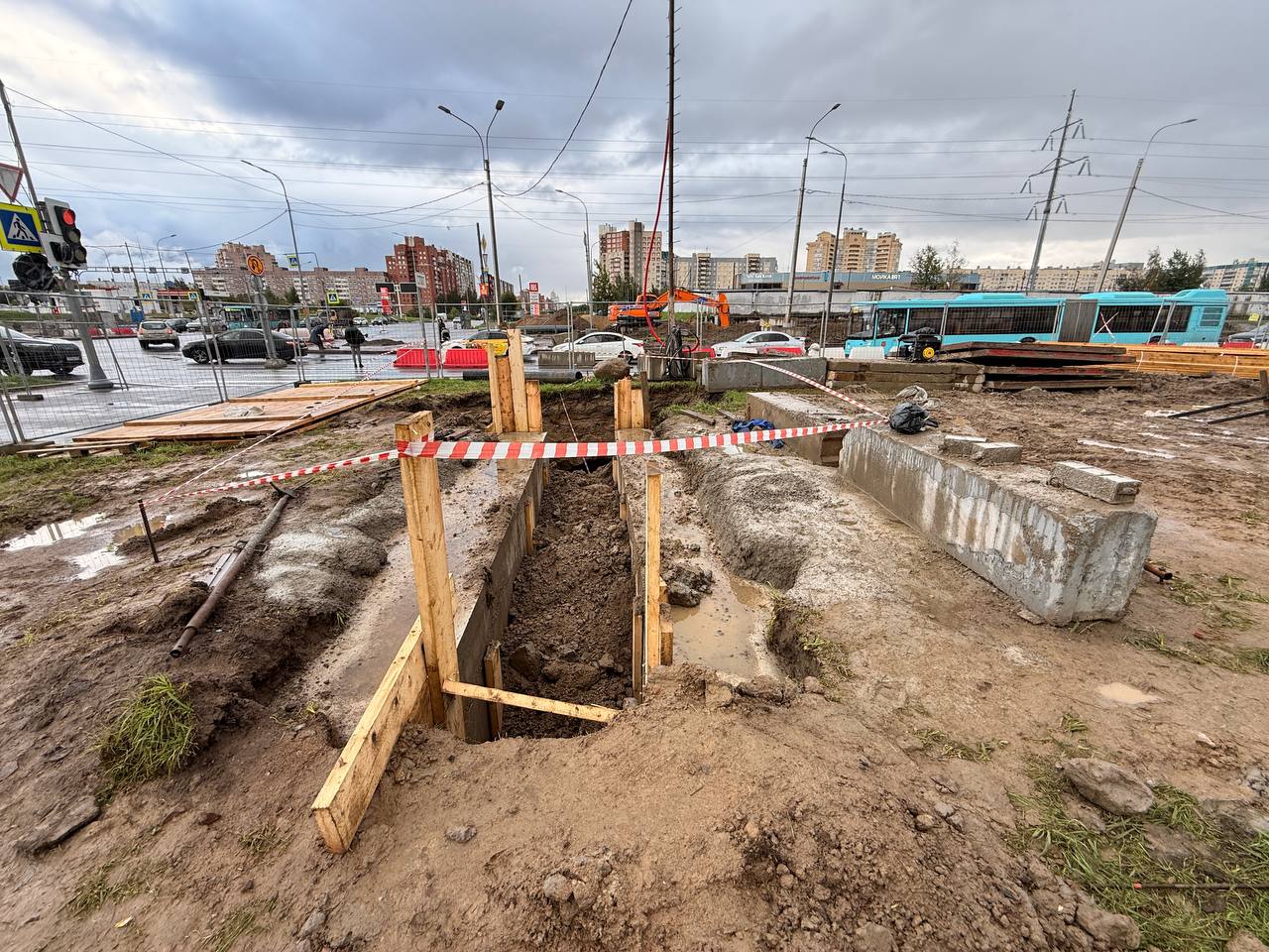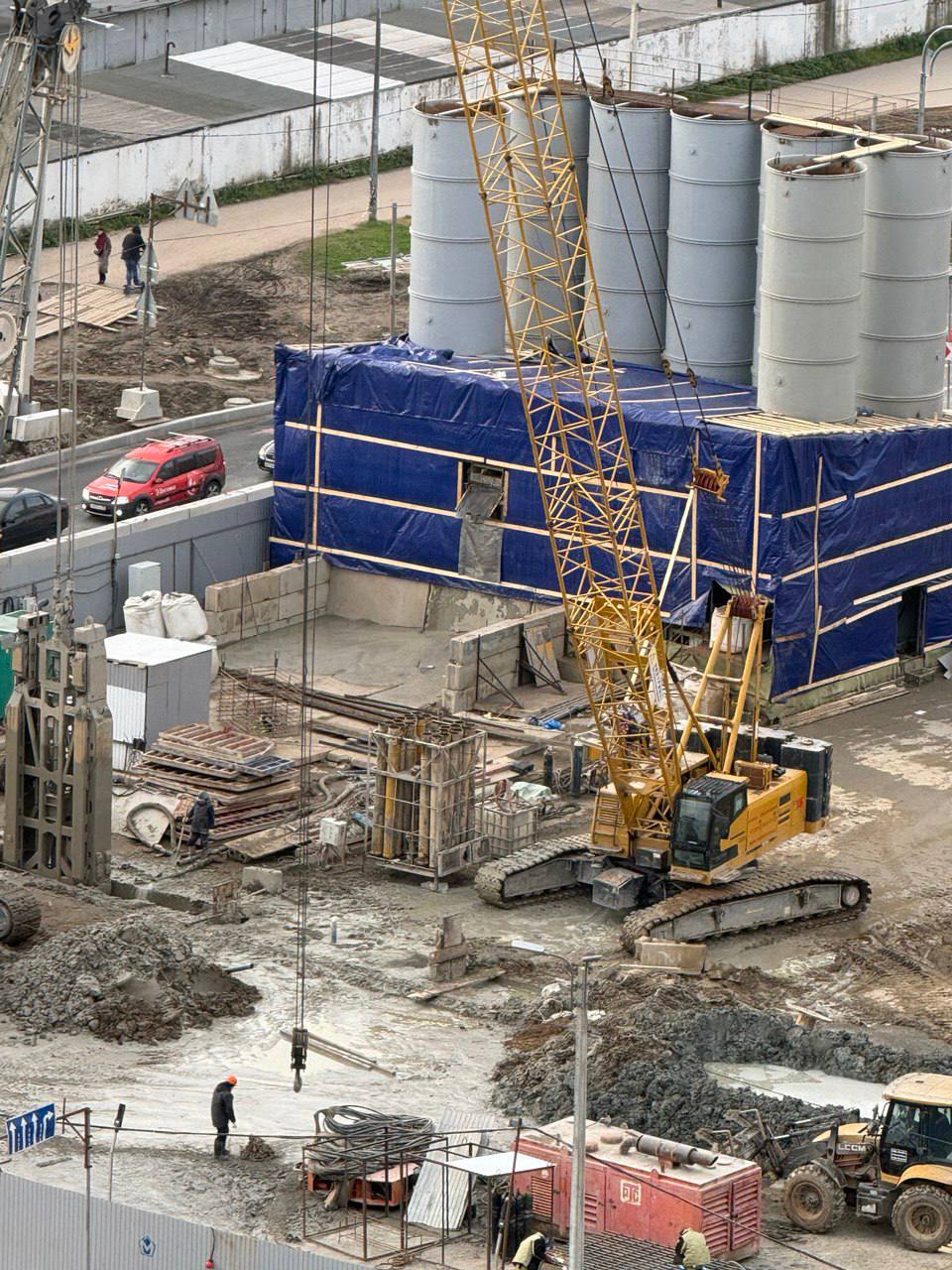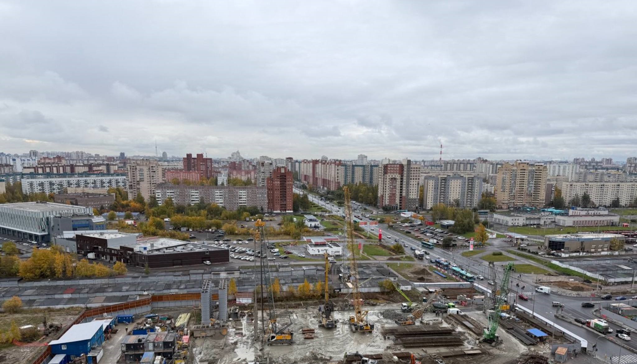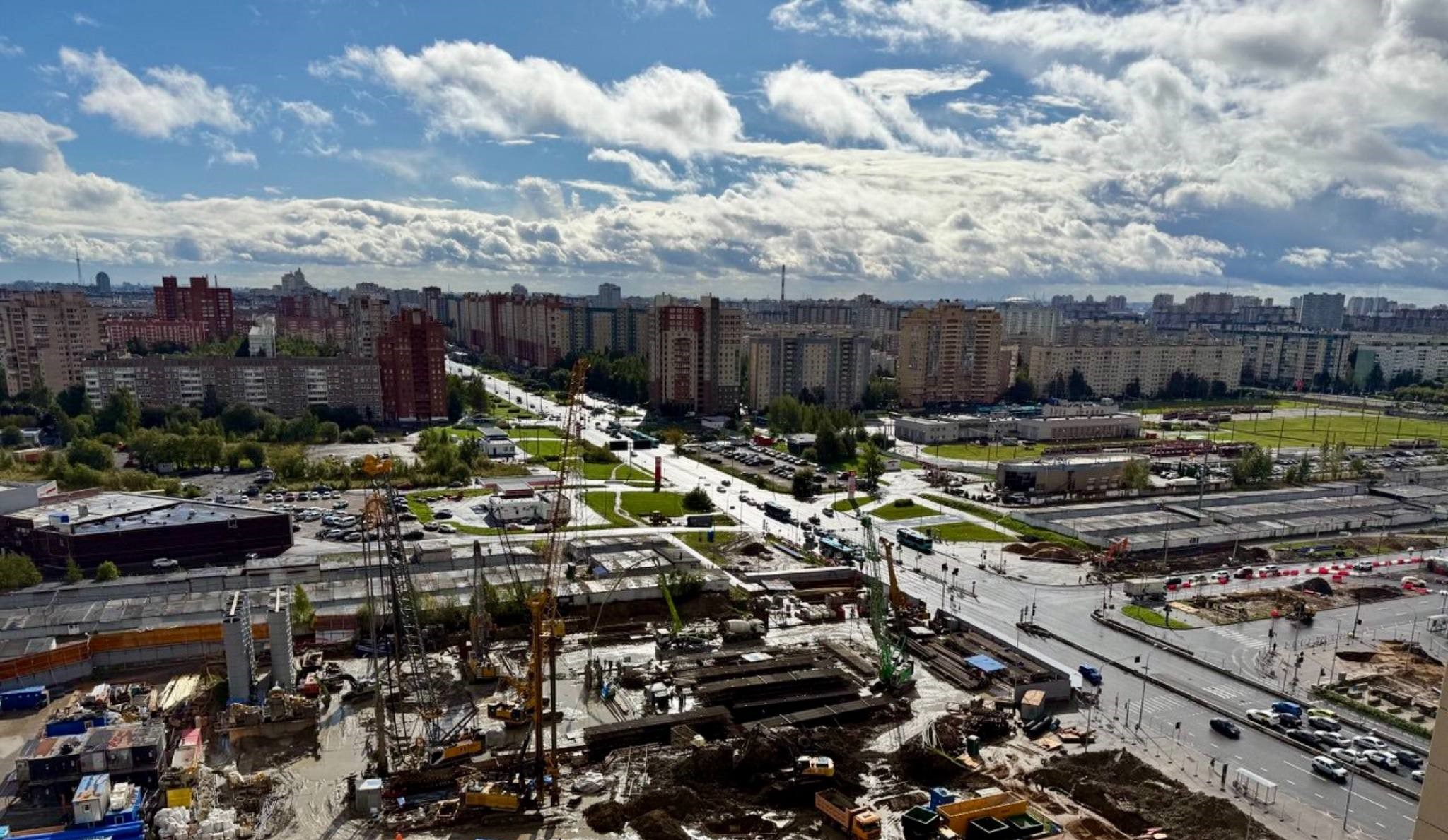 Вдоль Комендантского проспекта установлено временное ограждение из профлиста, а также оборудована крытая пешеходная галерея. Продолжаются работы по понижению уровня строительной площадки на участке от перекрёстка до подъездной дороги к гипермаркету «Лента».