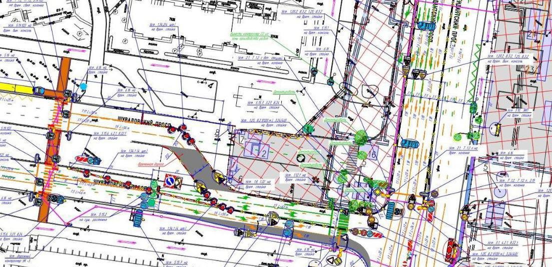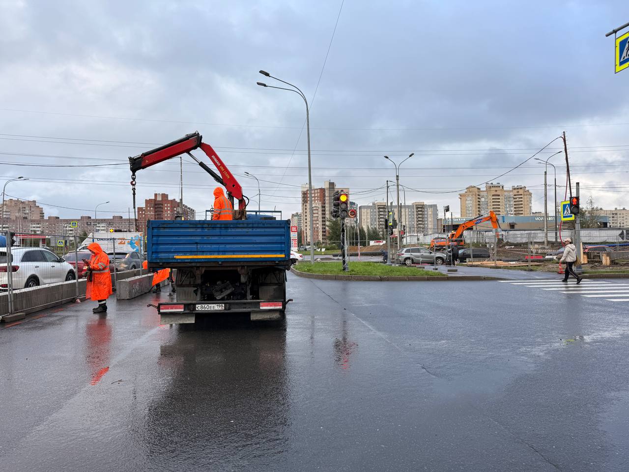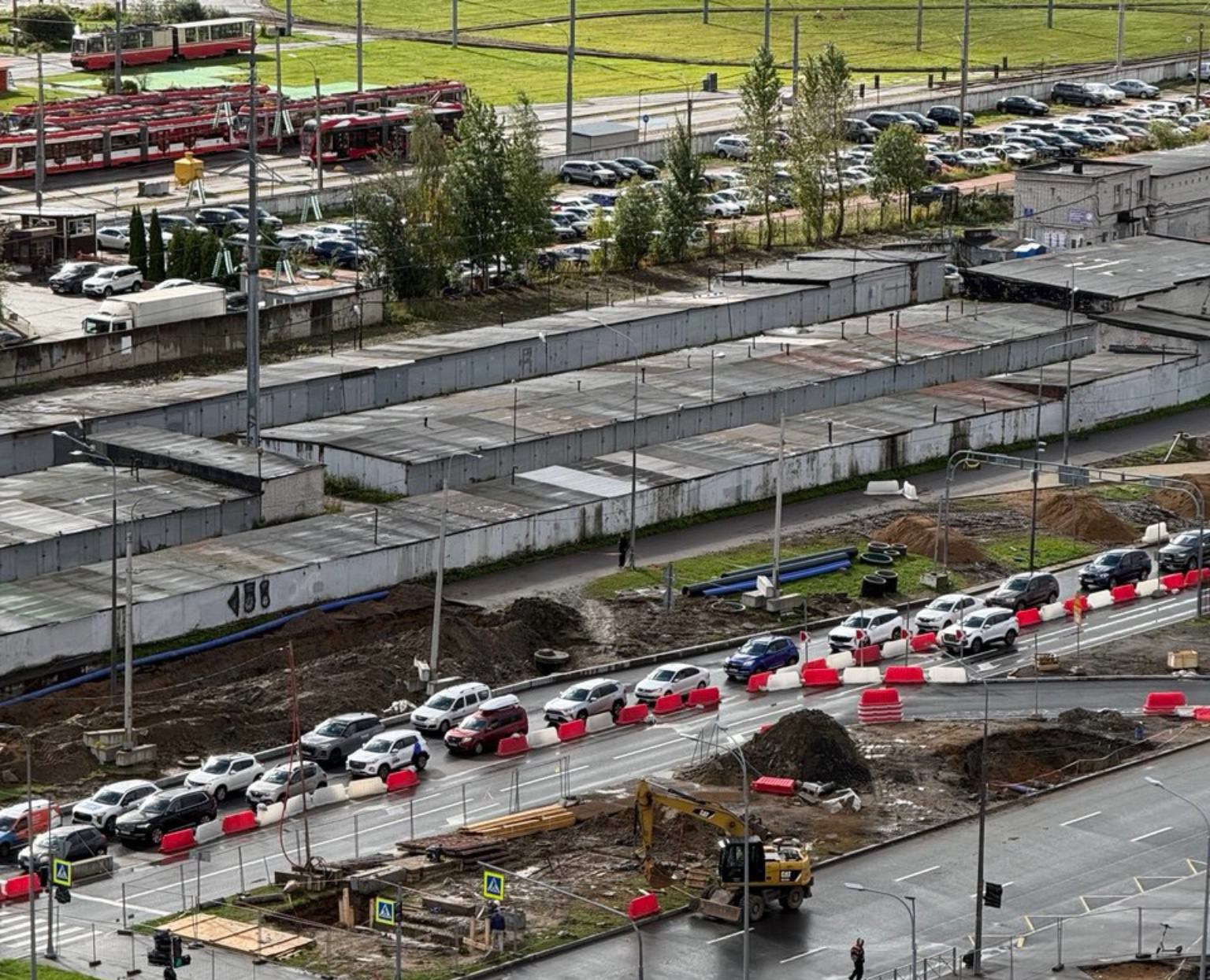 Перекрыли часть перекрёстка Шуваловский-Комендантский. Движение по временной схеме по два ряда в каждую сторону.