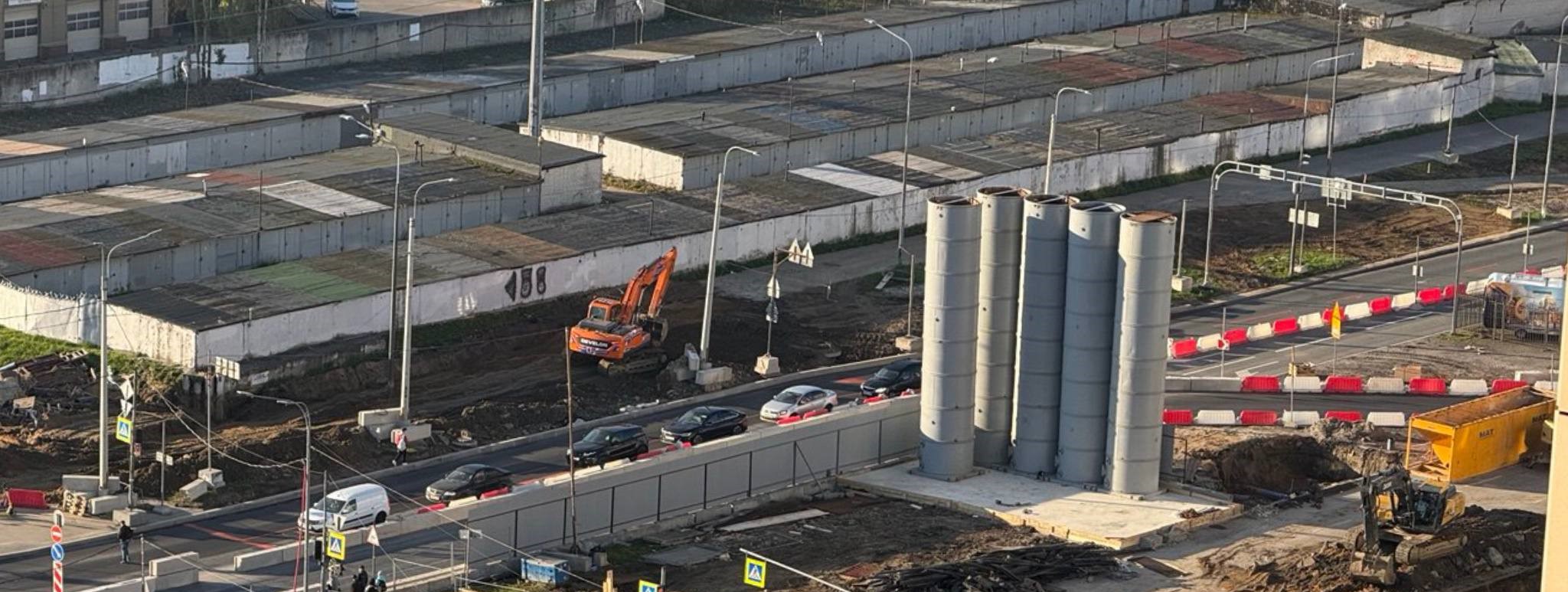 На разделительной полосе Шуваловского проспекта продолжается сооружение входной торцевой стены станции, через которую тоннелепроходческий комплекс (ТПМК) «Надежда» войдёт в границы станции «Каменка».