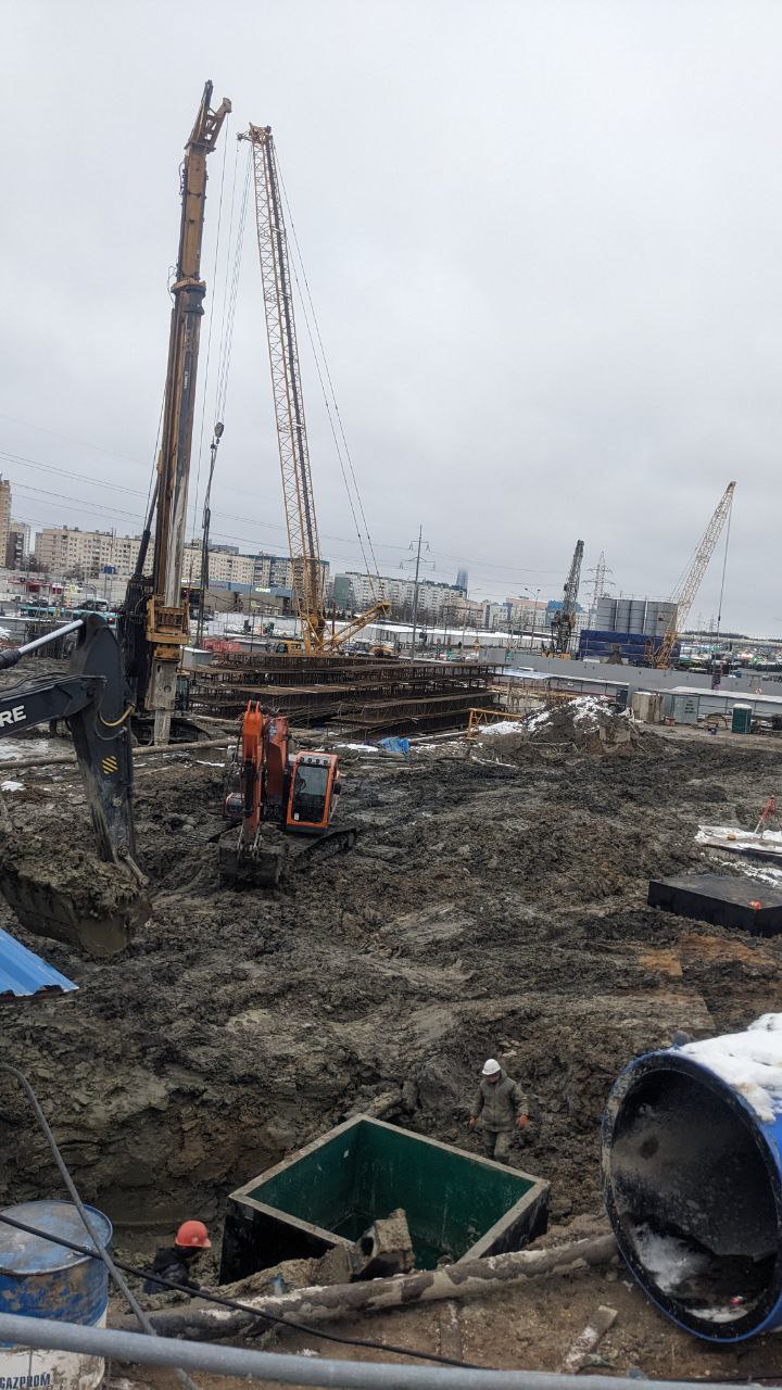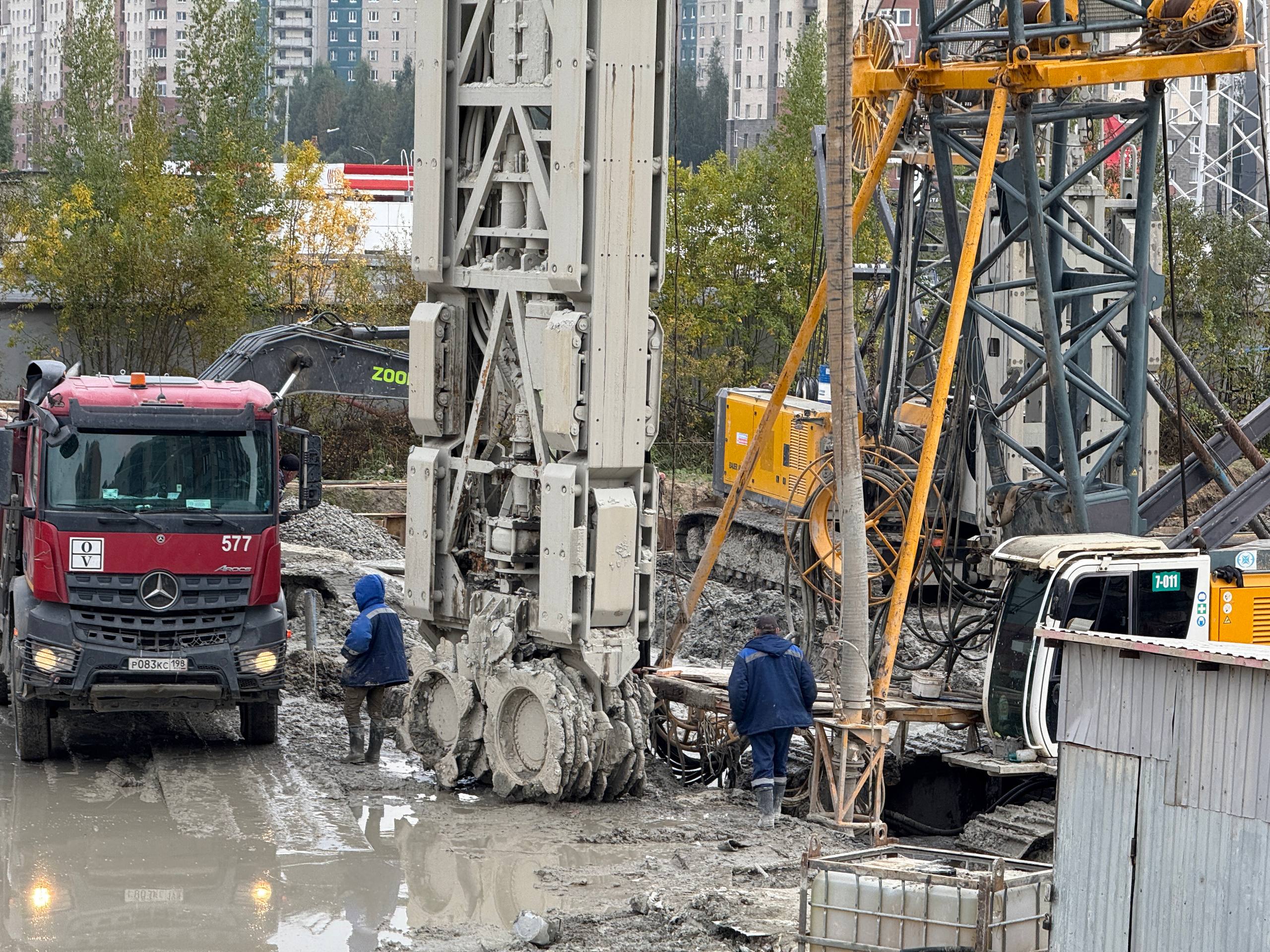 Для этого на разделительной полосе Шуваловского проспекта ведётся подготовка к сооружению форшахты. На данном этапе разрабатывается траншея шириной 1 метр и глубиной около 2,5 метров. После устройства песчаной подушки на дне траншеи устанавливается опалубка, монтируется арматурный каркас и производятся бетонные работы. По завершении этих операций по краям траншеи будут готовые железобетонные конструкции, напоминающие речные набережные. В дальнейшем на эту форшахту установят грейфер для выборки грунта.