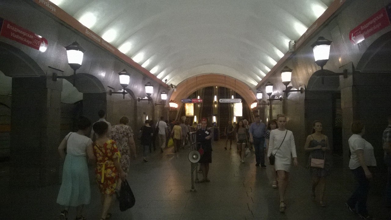 Организация изменения схемы движения на переходе Достоевская-Владимирская: с обеих сторон перехода дежурят работницы метрополитена с мегафонами, оповещая крупные массы пассажиров об изменении направления движения. Информация на 3 июля (спустя два дня после изменения схемы).