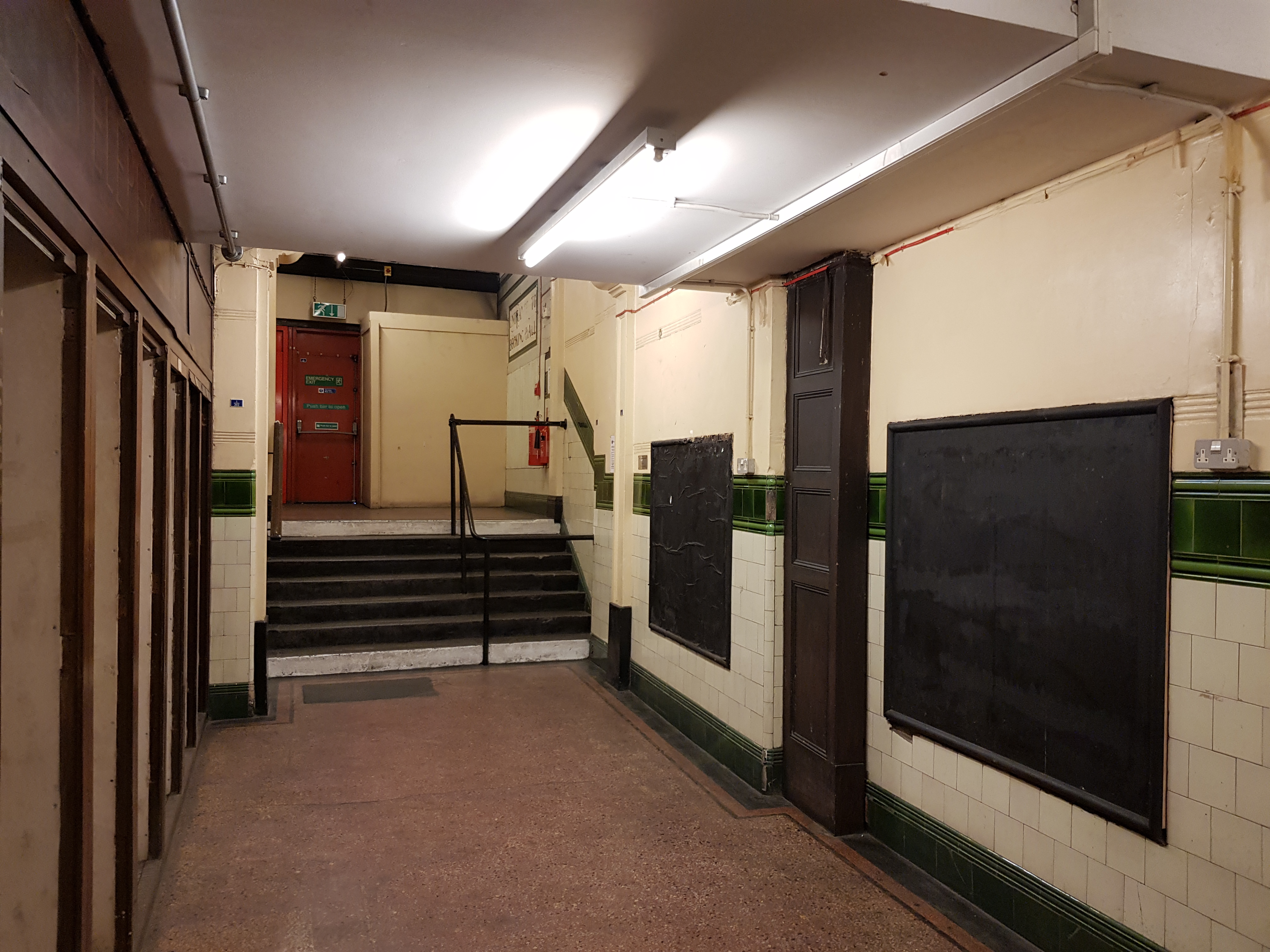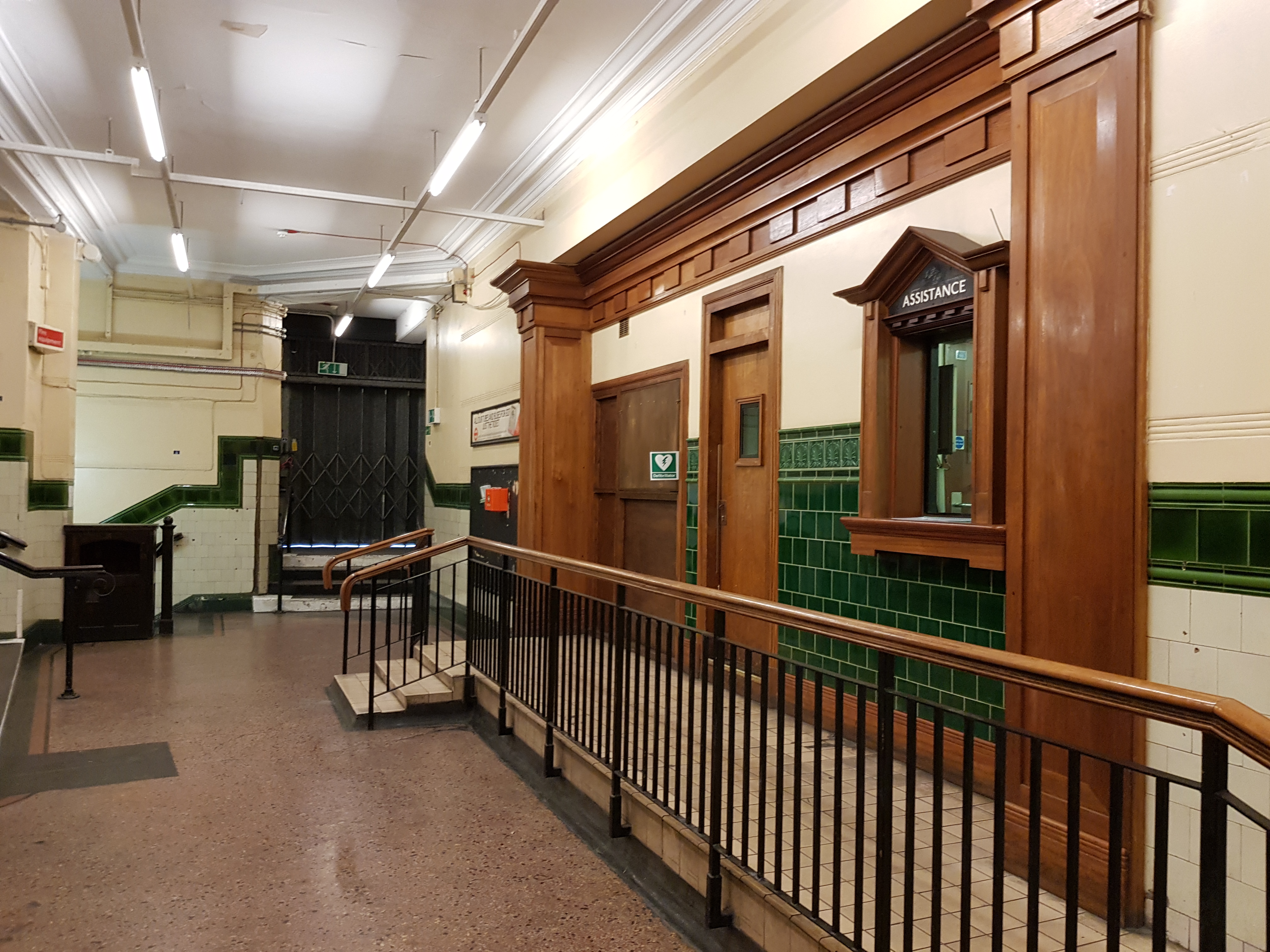 Вот вам для начала вид со стороны улицы, вид вестибюля изнутри и коридорчики. Спуск вниз осуществляется по лестнице (простите, вида сверху нет), непригодной для ежедневного использования обычными пассажирами. На последних фотках можно видеть что лифтов могло бы быть больше, но уже тогда догадывались что лишние лифты не понадобятся.