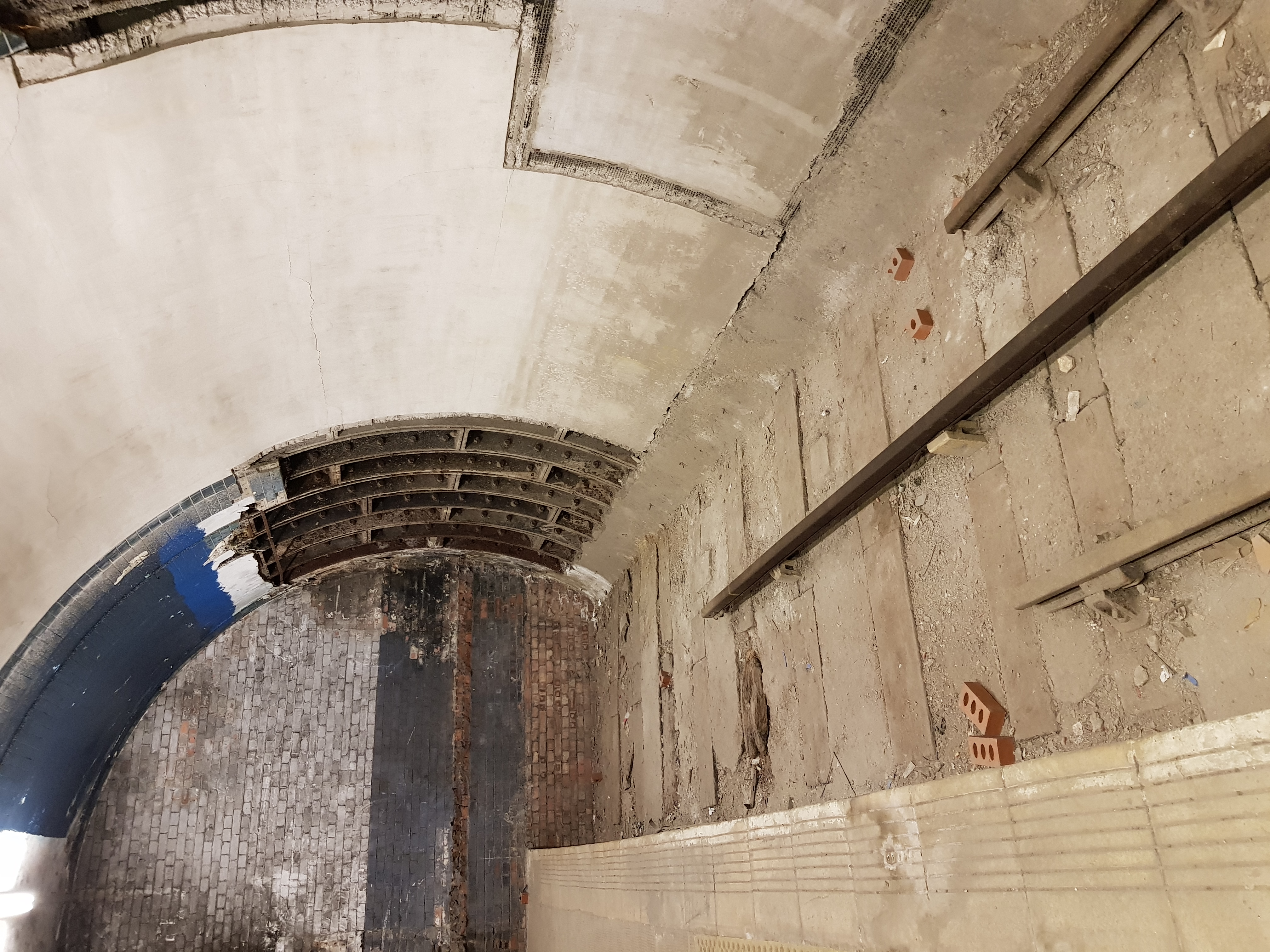На этих фото - та платформа, что пережила 1917 год. Поезд настоящий (но старый), тоннель в действующее метро - настоящий, плакаты - нет, это киношники повесили. Видно что на части станции потолок не отделан, а просто тюбинги покрашены - это они киношниками покрашены, изначально там отделки вообще не было (не помню стояла ли стена, как на Василеостровской, надо бы проверить).