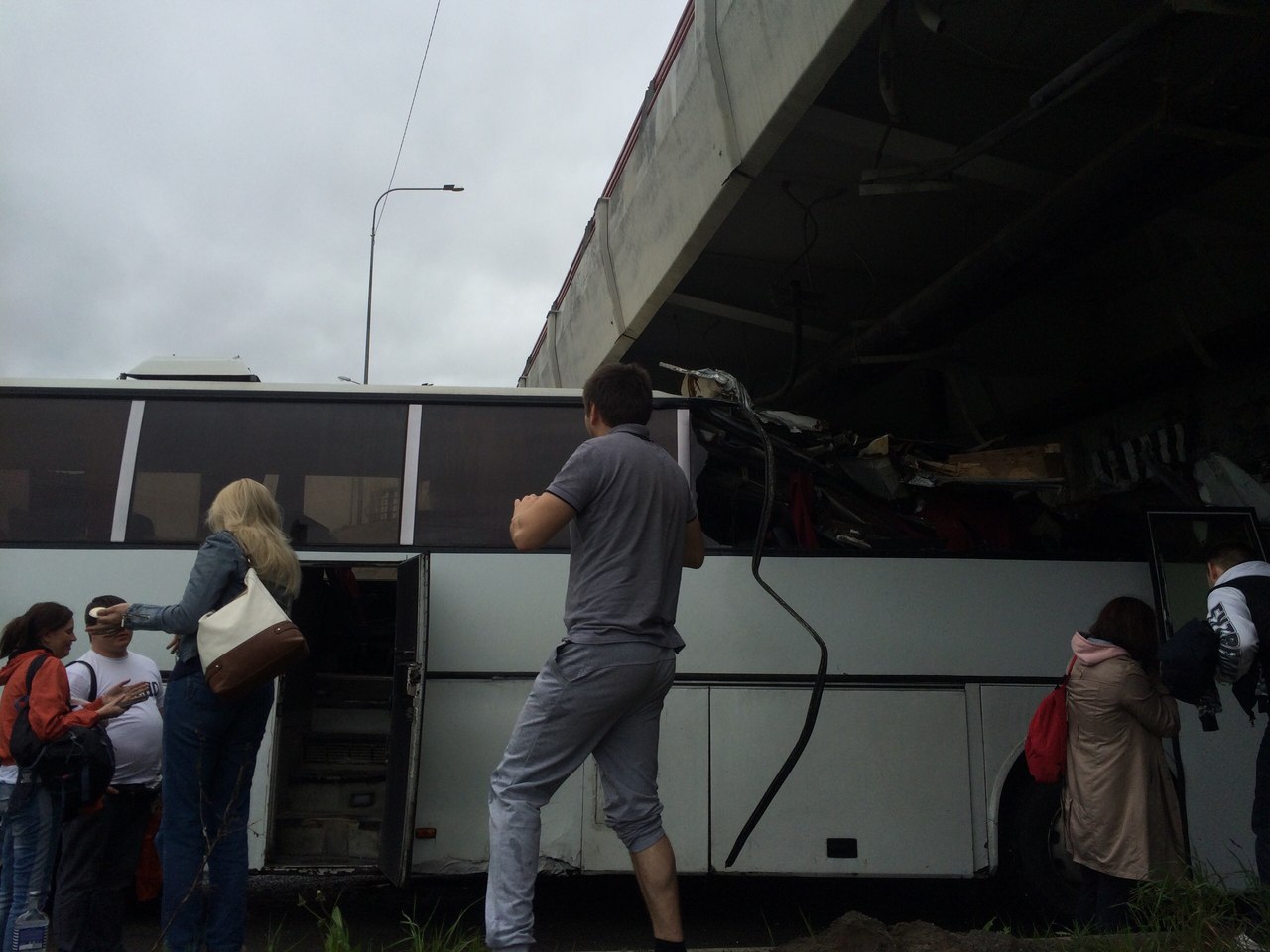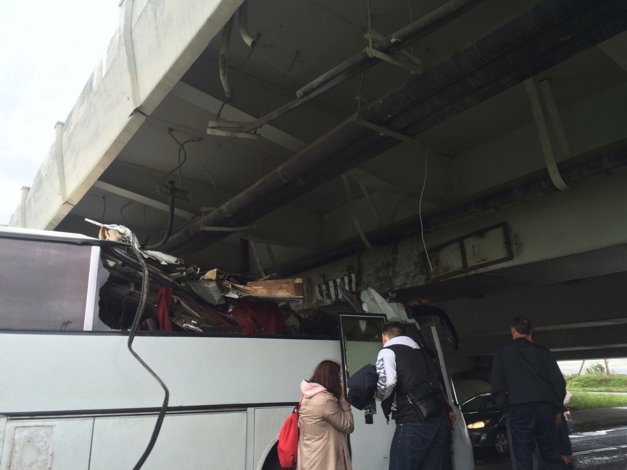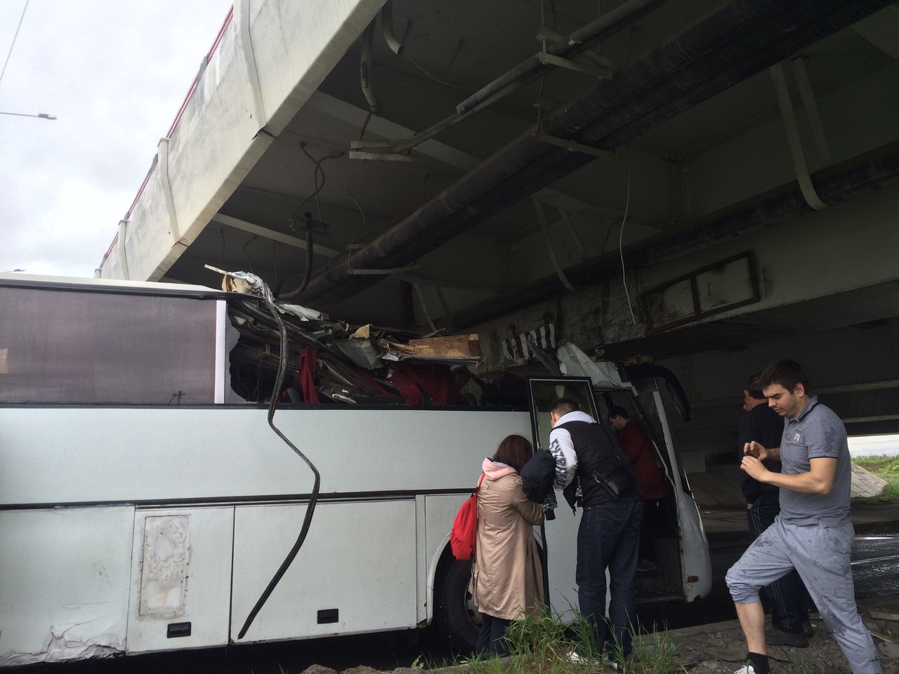 Автобус неправильно рассчитал свою высоту и высоту моста на Ленсоветовской под Софийской и врезался в него