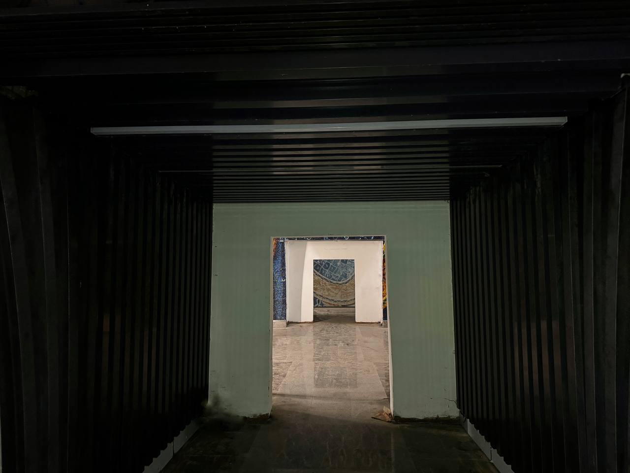 Временная стенка внутри прохода с проёмом под противопожарную дверь.