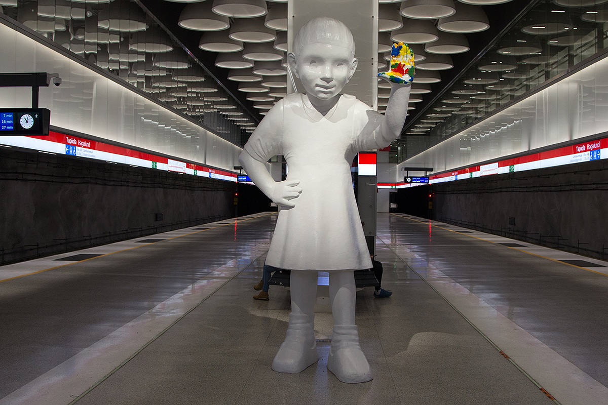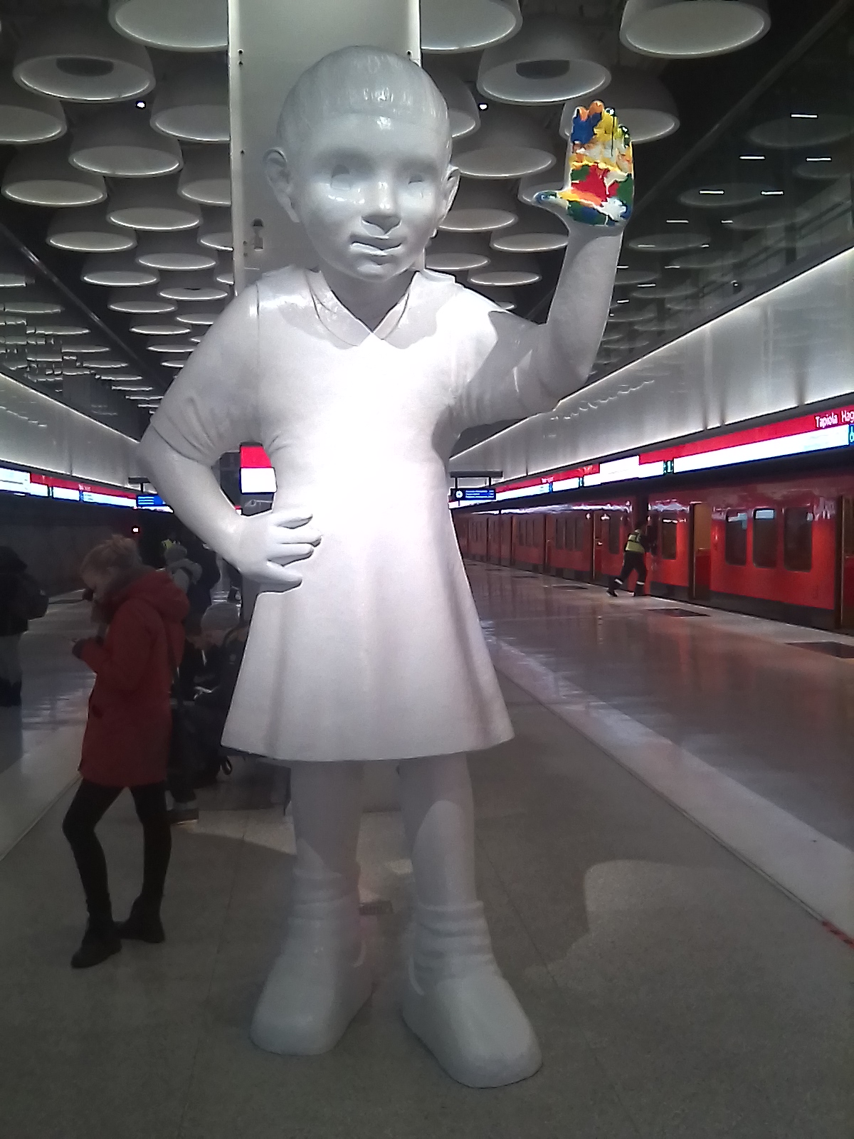 Будучи в командировке в Хельсинки, проехал по новому участку до станции Тапиола. Часть поездов оборачивается на ней,- стюарты в жёлтых жилетках осматривают вагоны и выгоняют заспавшихся пассажиров, точь-в-точь как у нас. Дальше не поехал, поскольку было уже поздно, да и то, что я увидел, не сильно впечатлило, хотя количество открытых станций и длина участка конечно же вызывает зависть. На станции Тапиола пассажиров встречает вот такое Чудо- Эмма, оставляющая отпечатки. Девочка изображена только что вынувшей ладонь из банки с разноцветными красками, чтобы оставить на стенах станции рисунки. Где-то на стенах уже имеются отпечатки (я их не заметил, прочел об этом позже). Вот такая статуя юной графитчицы. Первоначально авторы хотели собрать ей волосы в кичку, как у Крошки Мю из сказок и рисунков Туве Янсон, чтобы подчеркнуть волевой характер и целеустремленность, но потом отказались от этой идеи, поскольку статуя оказалась бы слишком статичной. Фигура сделана из бронзы и покрашена в белый цвет, заанкерена в бетон платформы болтами метровой длины.