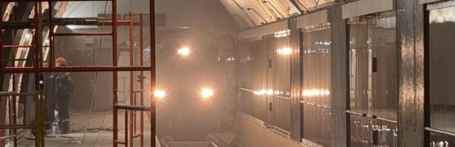 Обработан лоток, путевой бетон и торцевая стена под платформой в чёрный цвет.