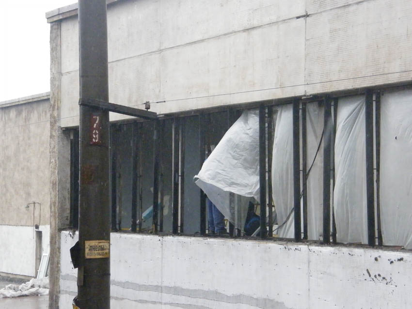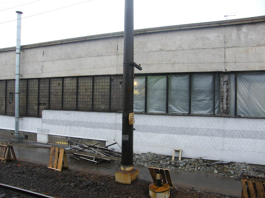 А тем временем начали ремонтировать фасад, выходяший на платформу ж/д: демонтируются стеклоблоки, на стенах делают "насечки" для лучшего последуюшего сцепления штукатурки или каких-либо облицовочных материалов, сверху уже закрепляют штукатурную сетку. Несколько фотографий: Середина здания пока нетронута.