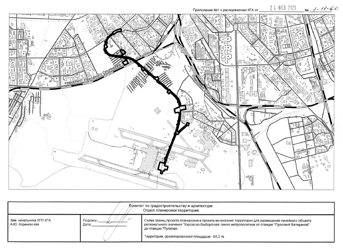 Подписано новое Распоряжение КГА от 24.02.2021 г. № 1-11-60 "О подготовке документации по планировке территории для размещения линейного объекта регионального значения "Кировско-Выборгская линия метрополитена от станции "Проспект Ветеранов" до станции "Пулково".