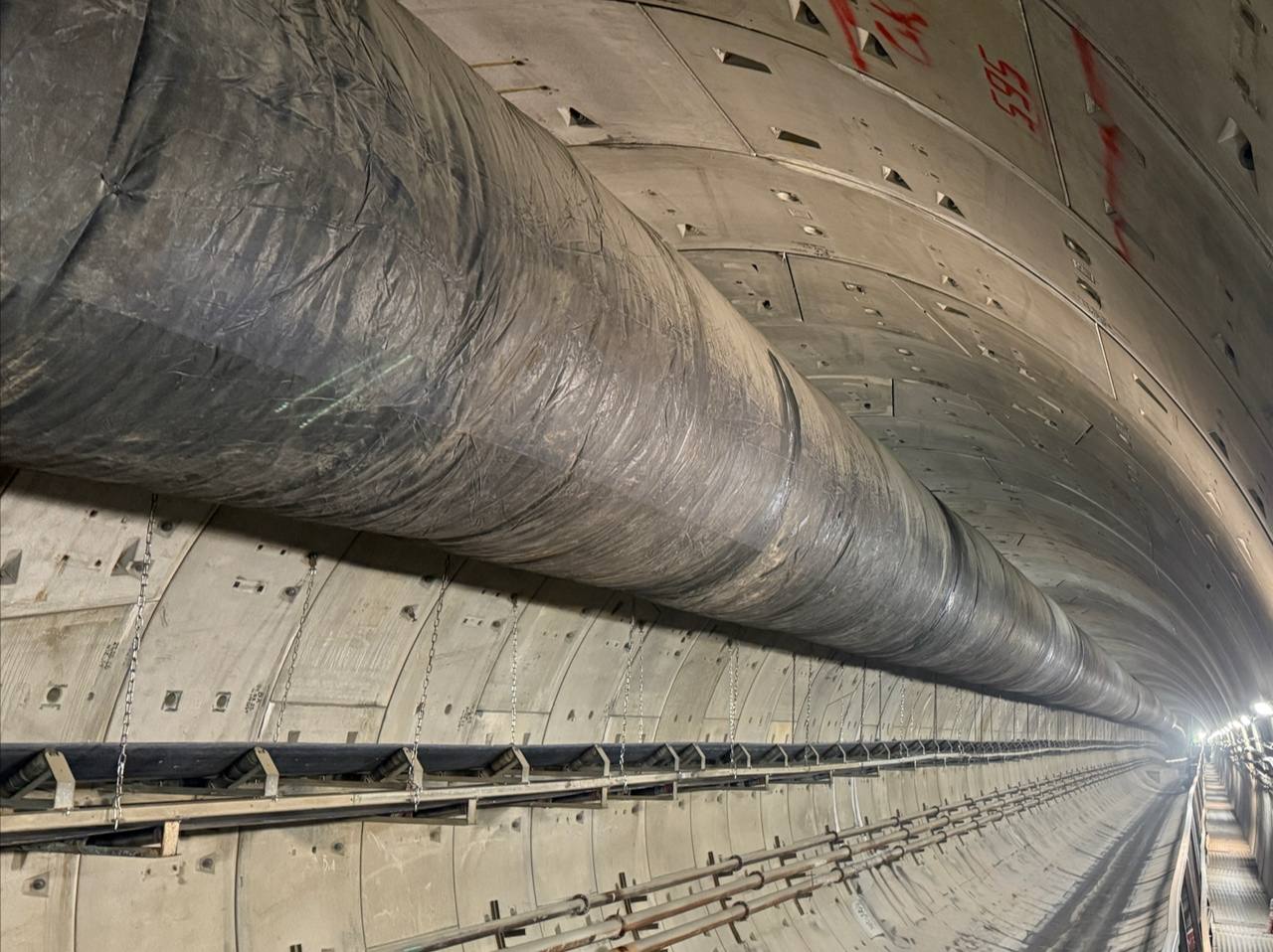 Как видно на фото, сейчас на её месте находится двухпутный перегонный тоннель, пройденный тоннелепроходческим механизированным комплексом (ТПМК) «Надежда». Понять, что здесь будет станция, можно лишь по интервалу колец и отметкам, оставленным строителями.