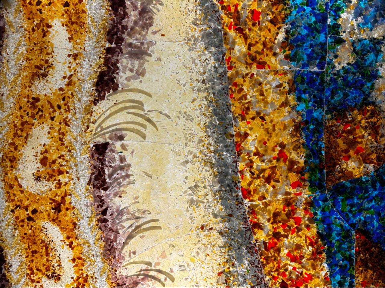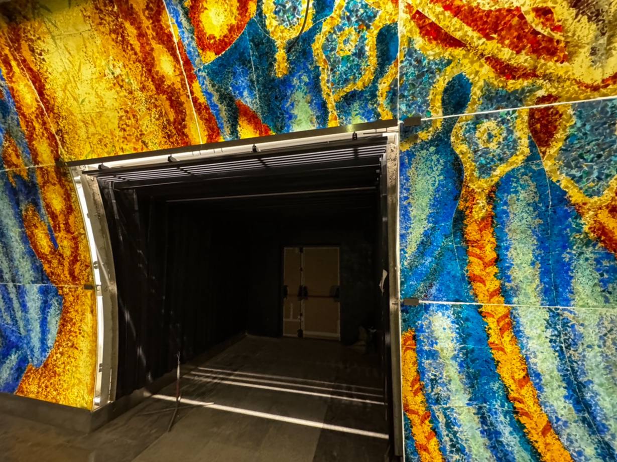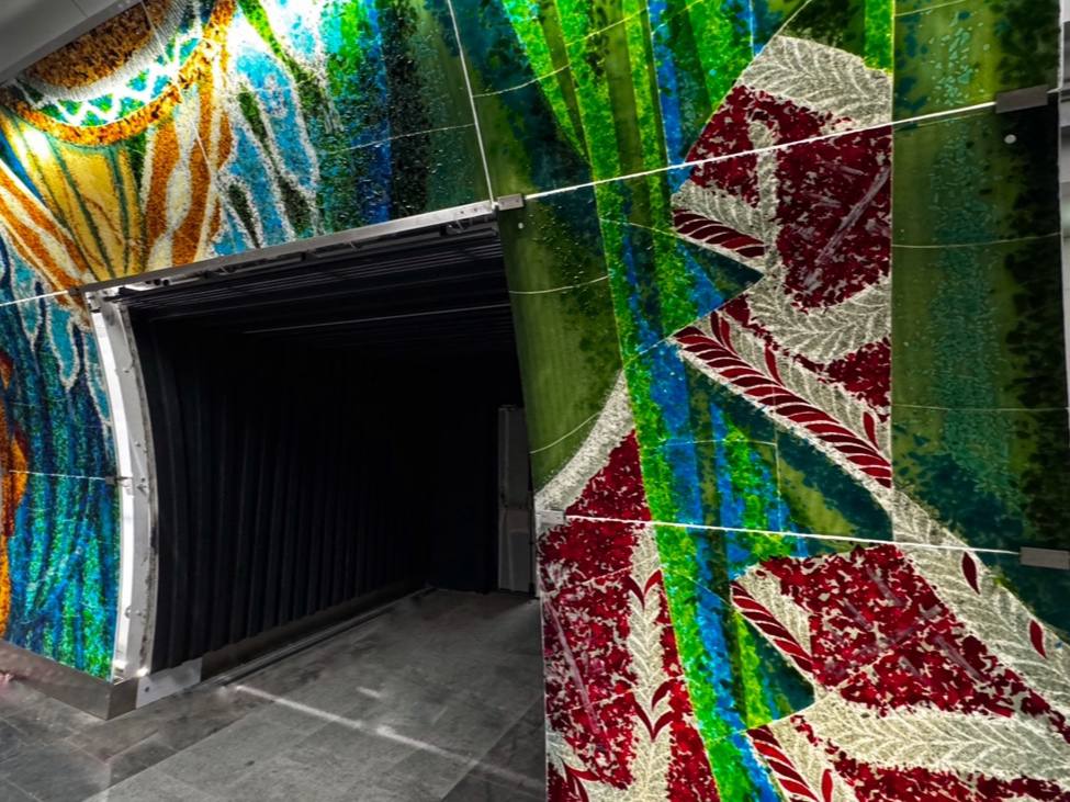 Фьюзинг - спекание/сплавление стеклянных кусочков в единое целое изделие при температуре до 1000°С. В нашем случае, с помощью техники фьюзинга, создавали стеклянные витражи оформления пассажирских проёмов.