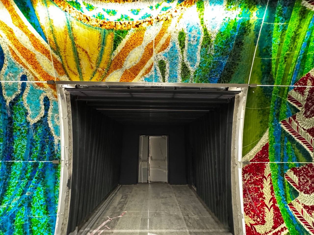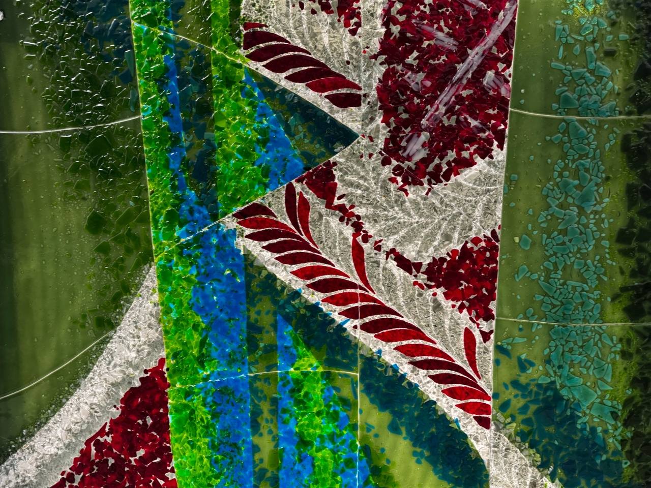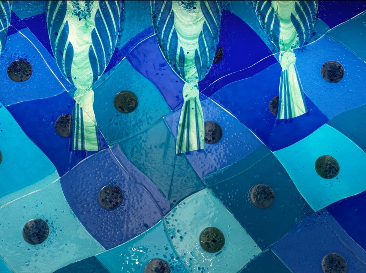 Фьюзинг - спекание/сплавление стеклянных кусочков в единое целое изделие при температуре до 1000°С. В нашем случае, с помощью техники фьюзинга, создавали стеклянные витражи оформления пассажирских проёмов.
