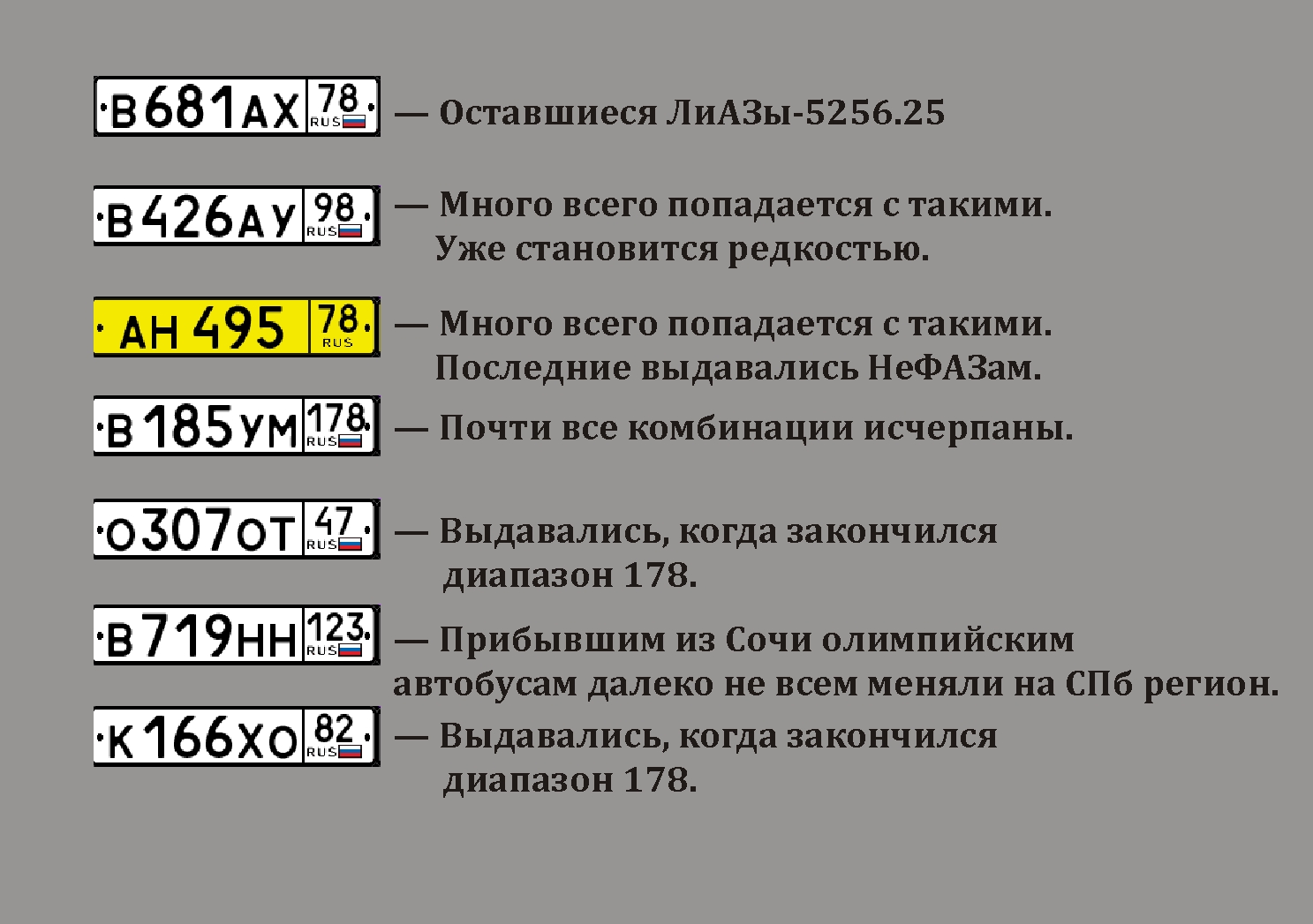 Заметил интересный факт. Одновременно в СПб автобусы можно встретить с 7 разными номерами регионов (см. на фото). Почти столько же, сколько и в Москве. Не учтены единичные номера, только те, которые от 10 и более.