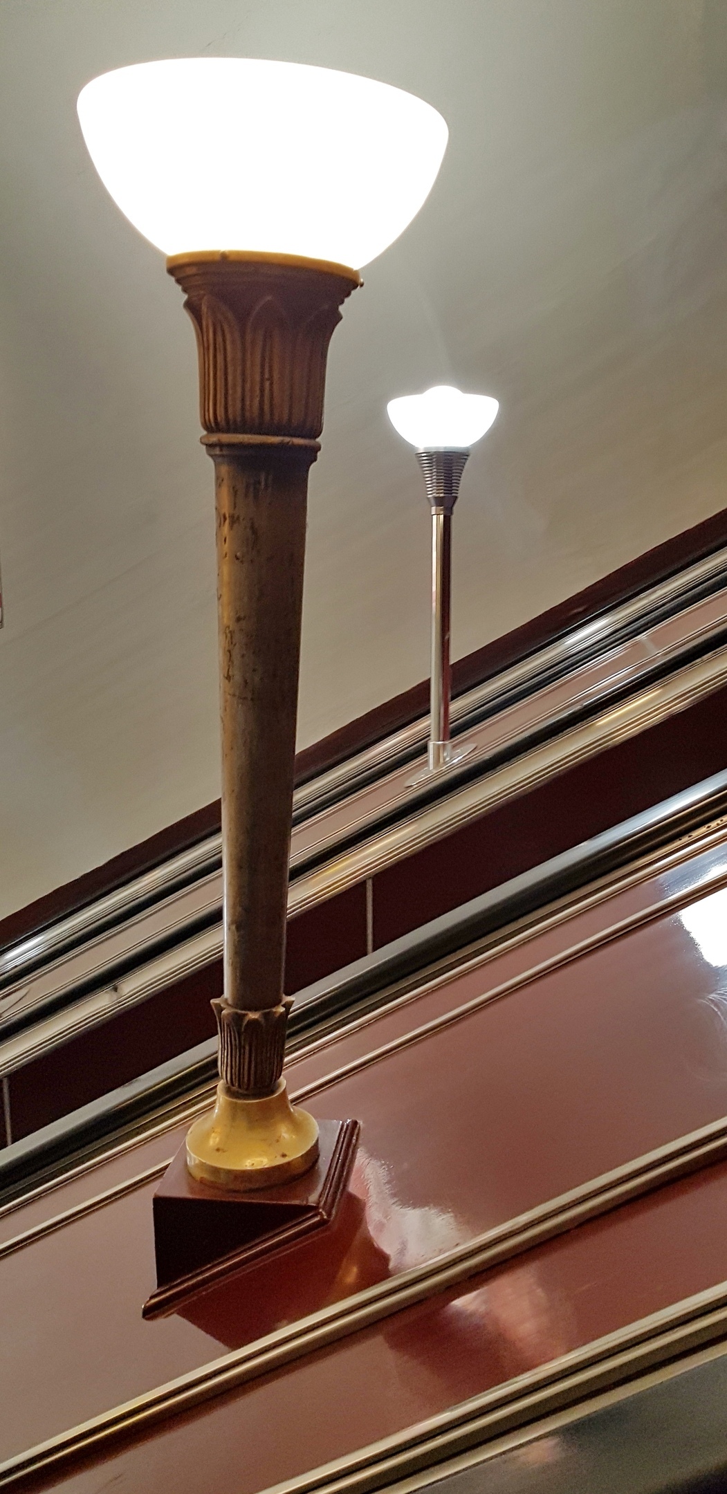 На станции метро "Площадь Ленина" вместо оригинальных светильников бронзового цвета с декором на эскалаторах начали устанавливать новодел из нержавейки.
