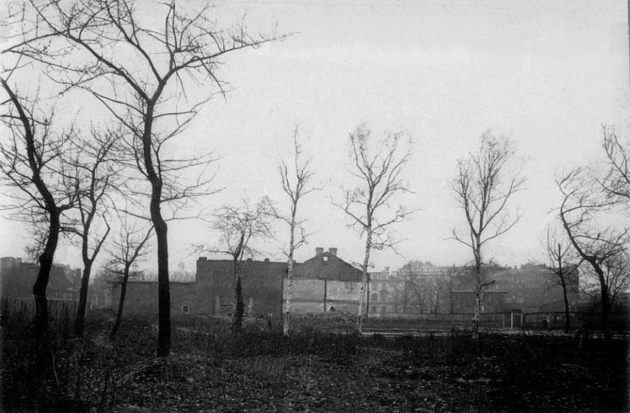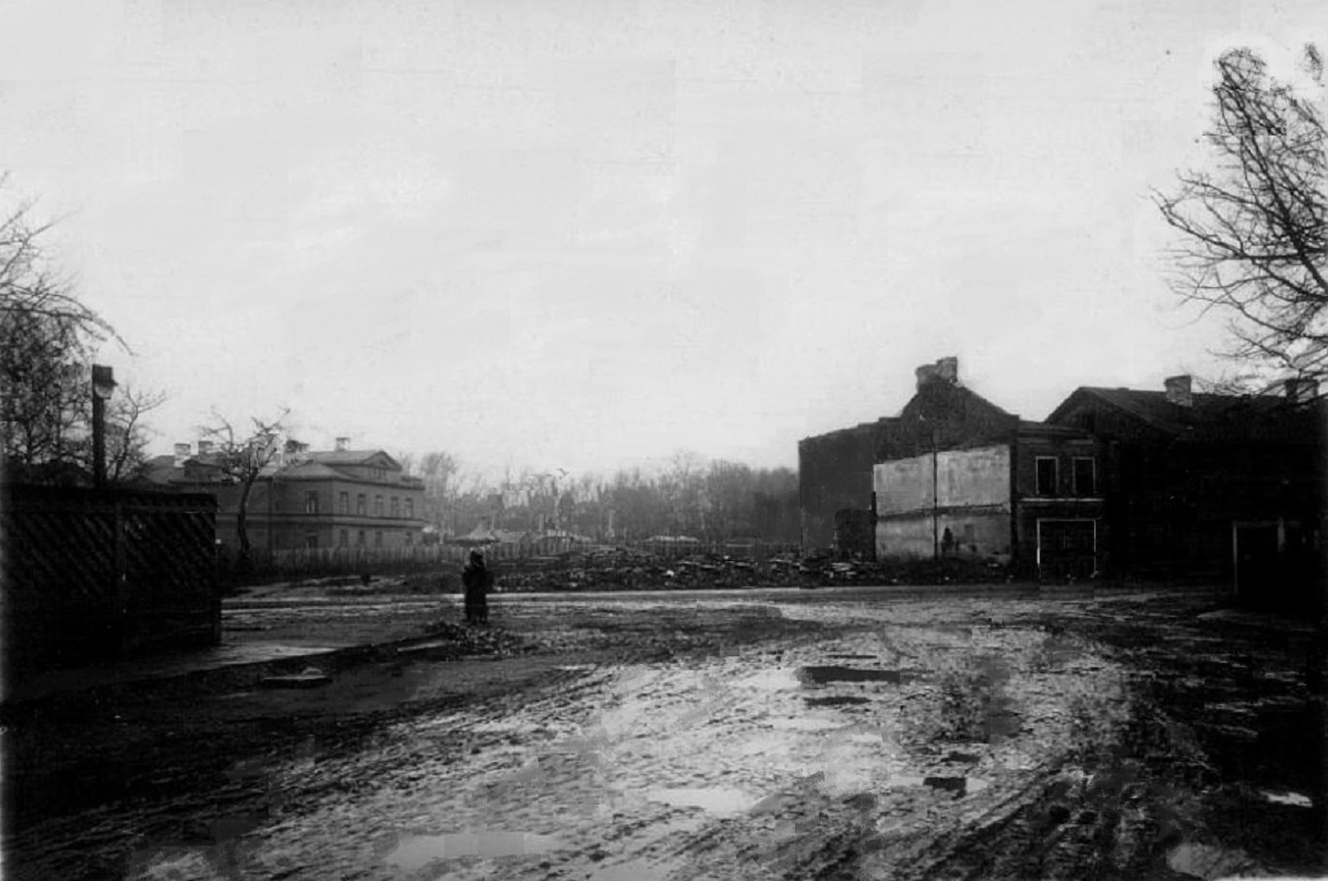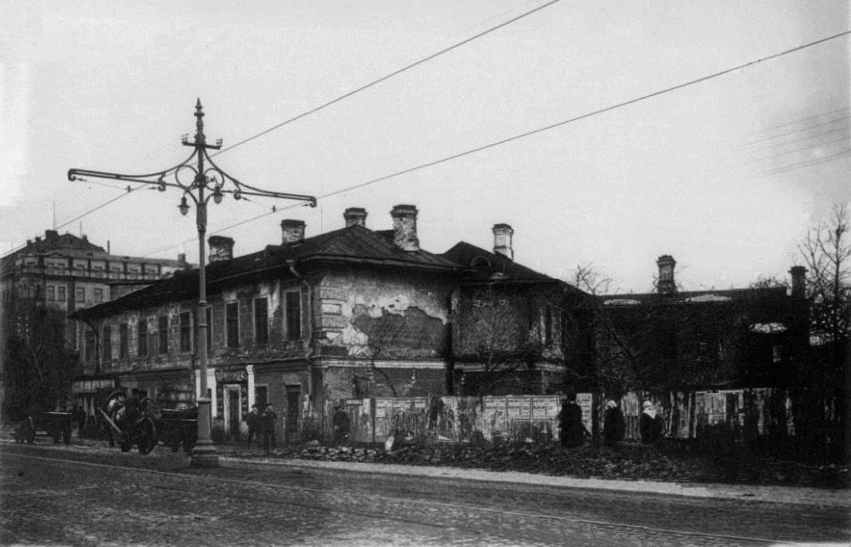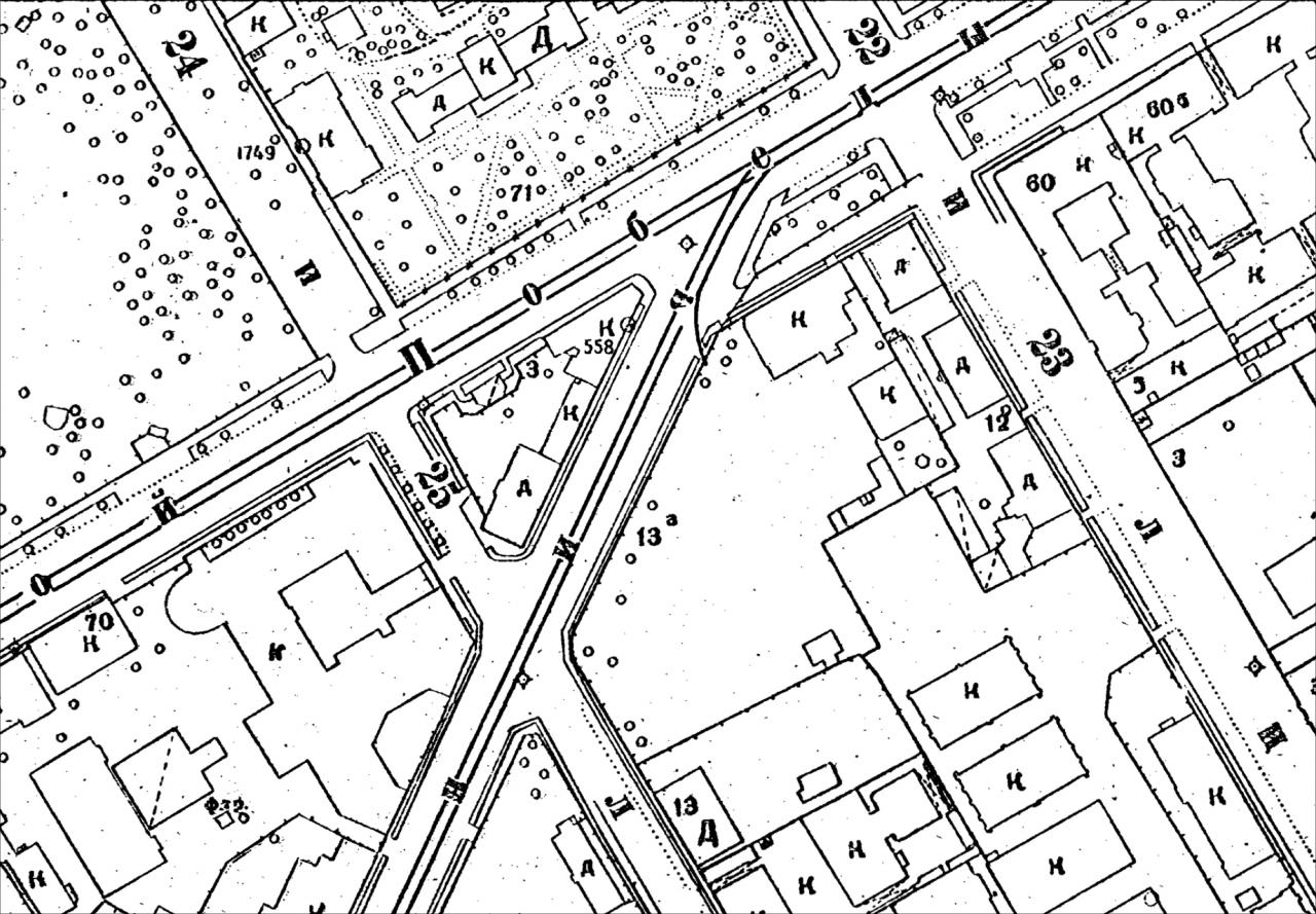 Местоположение дома - в восточном углу треугольного участка, который можно видеть в центре фрагмента плана 1934 года. Позже (но еще до войны) застройка этого квартала была ликвидирована, и на его месте возникла площадь, на которой сейчас строится станция метро.