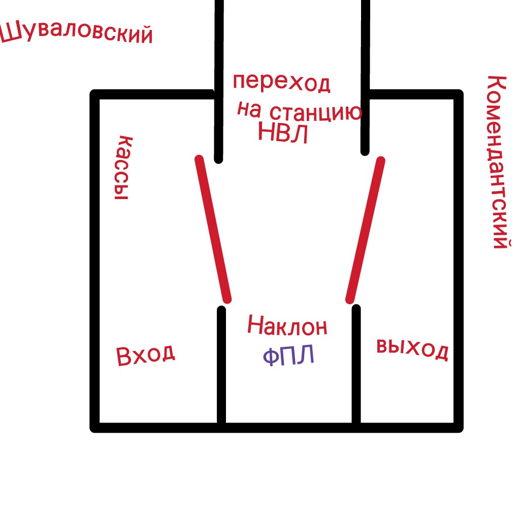 У станции НВЛ входной вестибюль на пересечении Авиаконструкторов и Шуваловского, у станции ФПЛ вестибюль на пересечении Комендантского и Шуваловского.