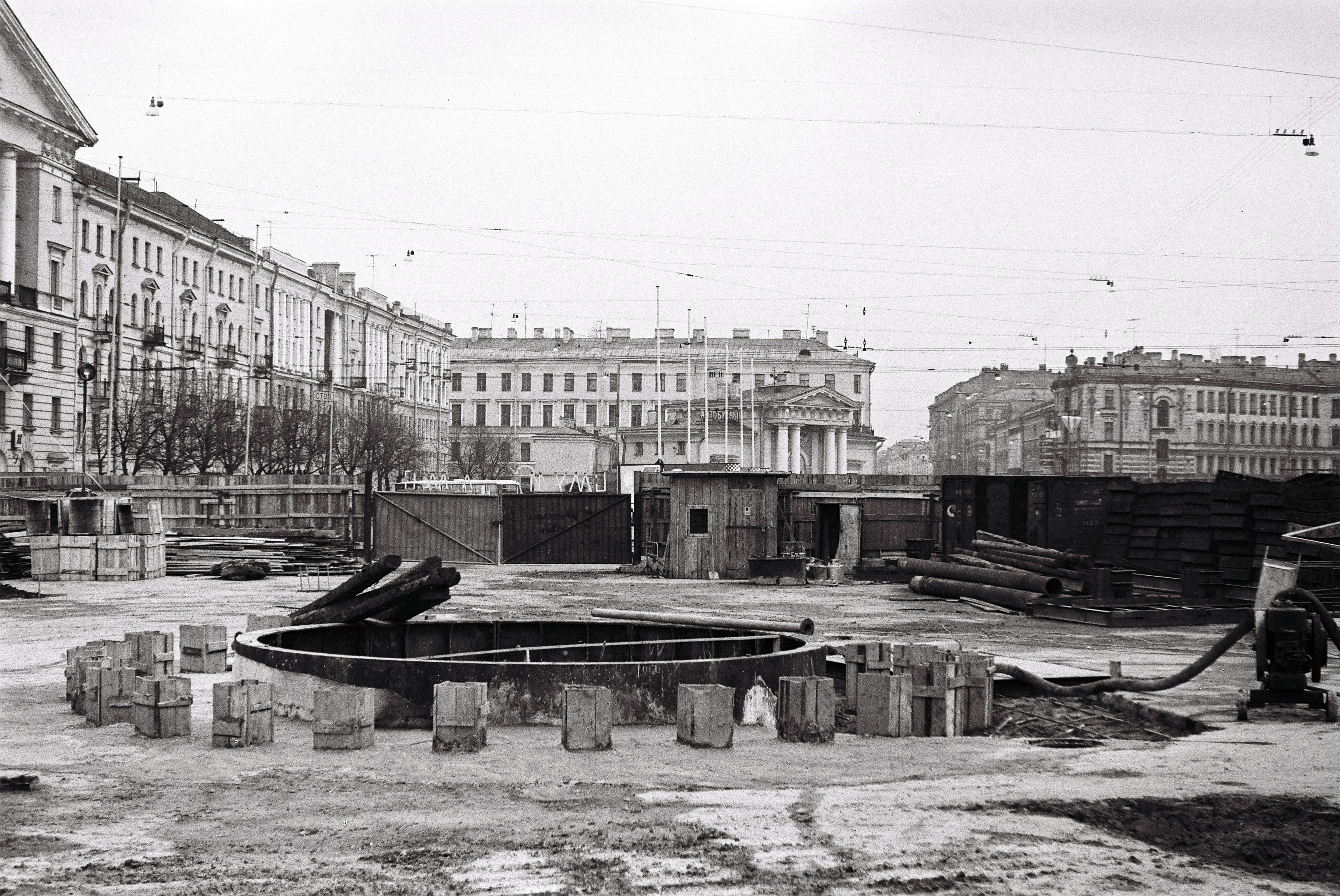 532 шахта. Строительство станции "Проспект Большевиков" (строительной название "Улица Коллонтай"). Рядом с шахтным копром - бункер для сушки песка (из тюбингов). На заднем плане видны блоки верхнего свода односводчатой станции (с одним отверстием под монтажную шпильку). Следовательно, верхний свод полностью ещё не пройден. Год 1983-84 примерно.