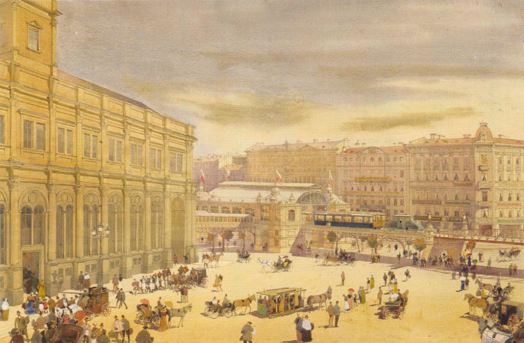 Более всего похоже на площадь Восстания, пересечение Невского с Лиговским (допустим, канал виделся засыпанным... почему-то запомнилось, что большинство дореволюционных проектов прокладки линий предусматривали задействованные каналы). Уходящая вдаль улица явно широкая, тогда как перед перекрёстком она заметно сужена. Есть один момент: тень слева. Её форма очень напоминает тень от Московского вокзала.