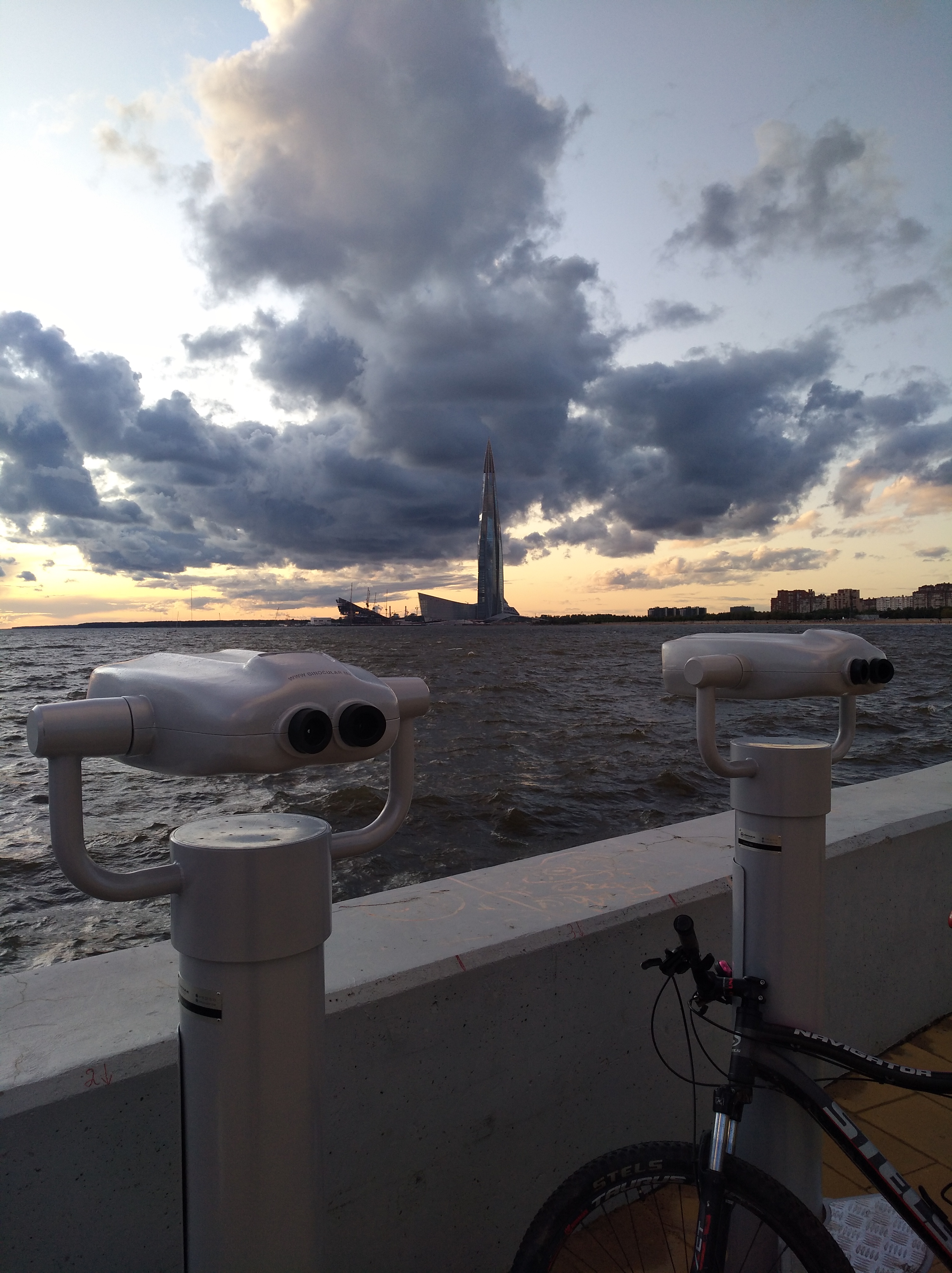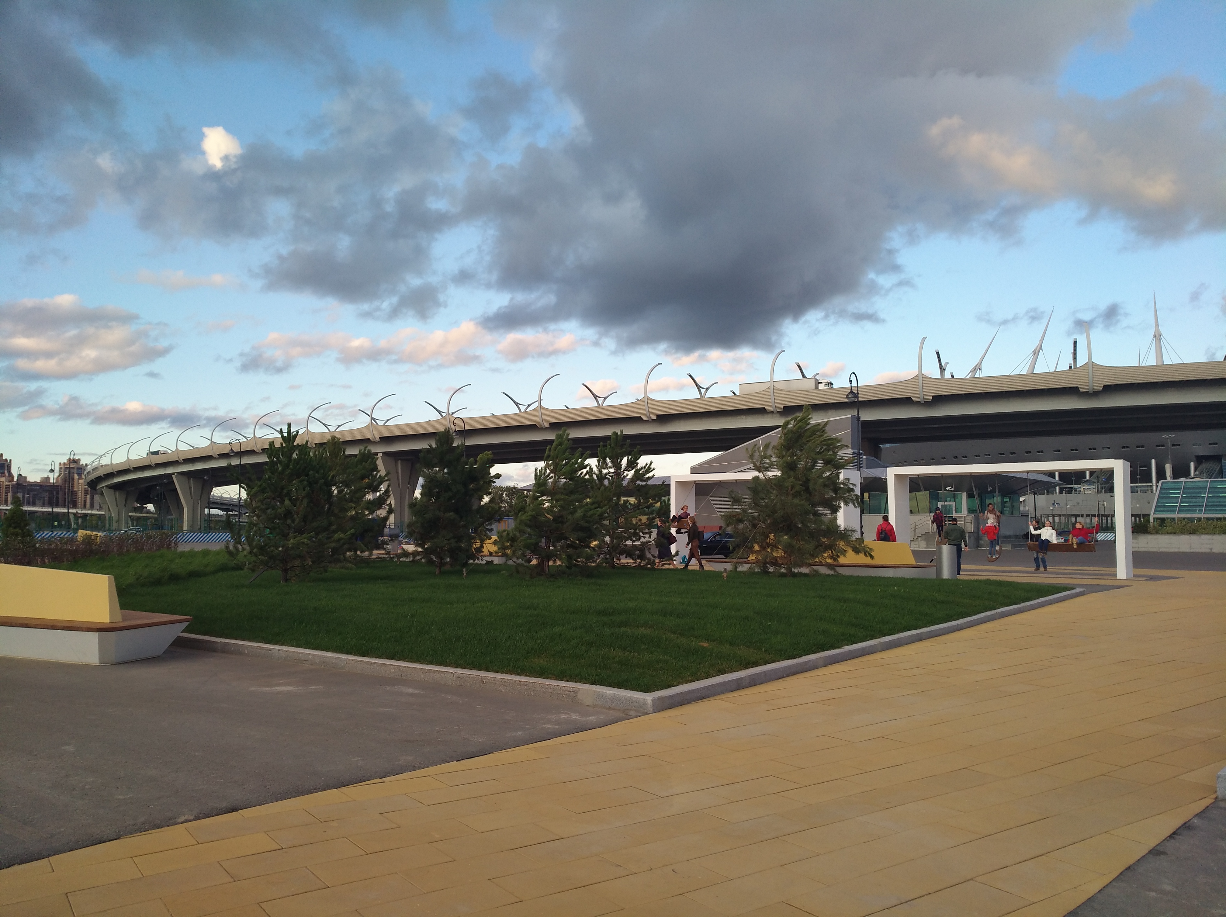 Давеча катался на велосипеде. Стало лучше. Это уже не безжизненный асфальтовый пустырь, что был здесь ранее. Вечер субботы, но штормовой ветер не способствовал променаду и было немноголюдно. Однако, качели и бинокли пользовались спросом. Желтый цвет плитки приятный. Молодые елочки очень приглядные.