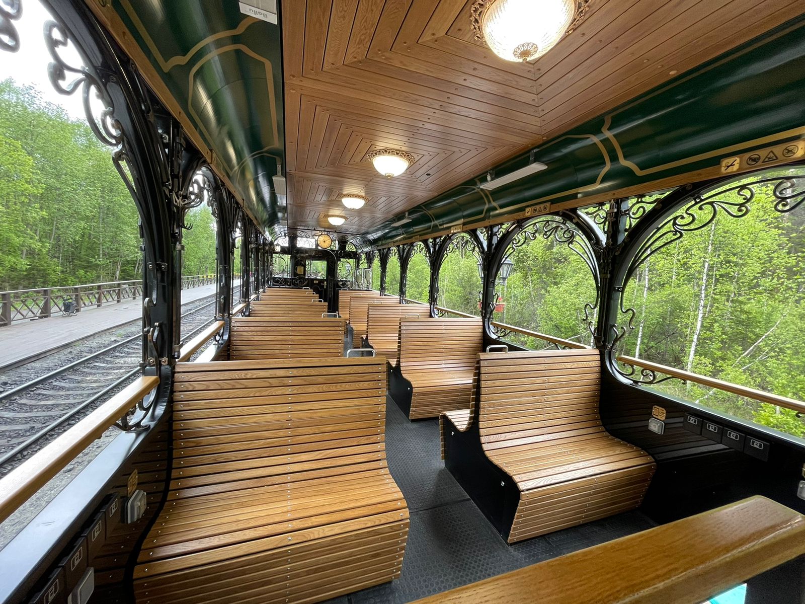 Ну и вид внутри, с инфракрасными обогревателями под потолком, которые убивают всю атмосферу «старинности». Эффекта от этих обогревателей ровно 0. Человеку комфортно, когда ноги в тепле, а не голова, а так как там задувает при движении, то и греют они ровно ничего.