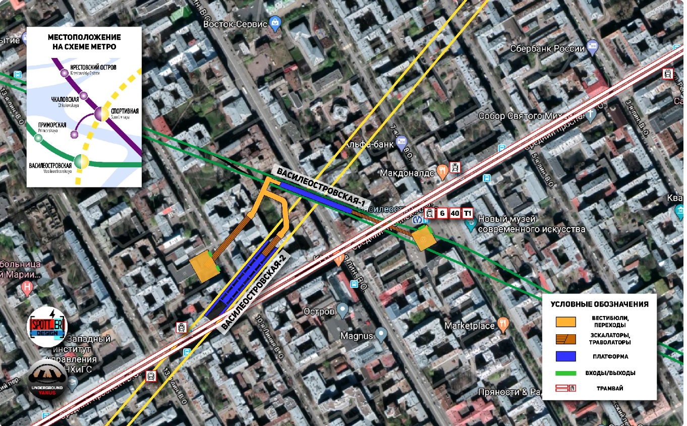 Три выхода и правда много. Интересно было бы рассмотреть вариант с выходом с Василеостровской-2 на Среднем 50 без "второго выхода" на 11-ю линию, 35, а просто с соединением двух станций под землей переходным коридором и, вероятно, эскалаторами.