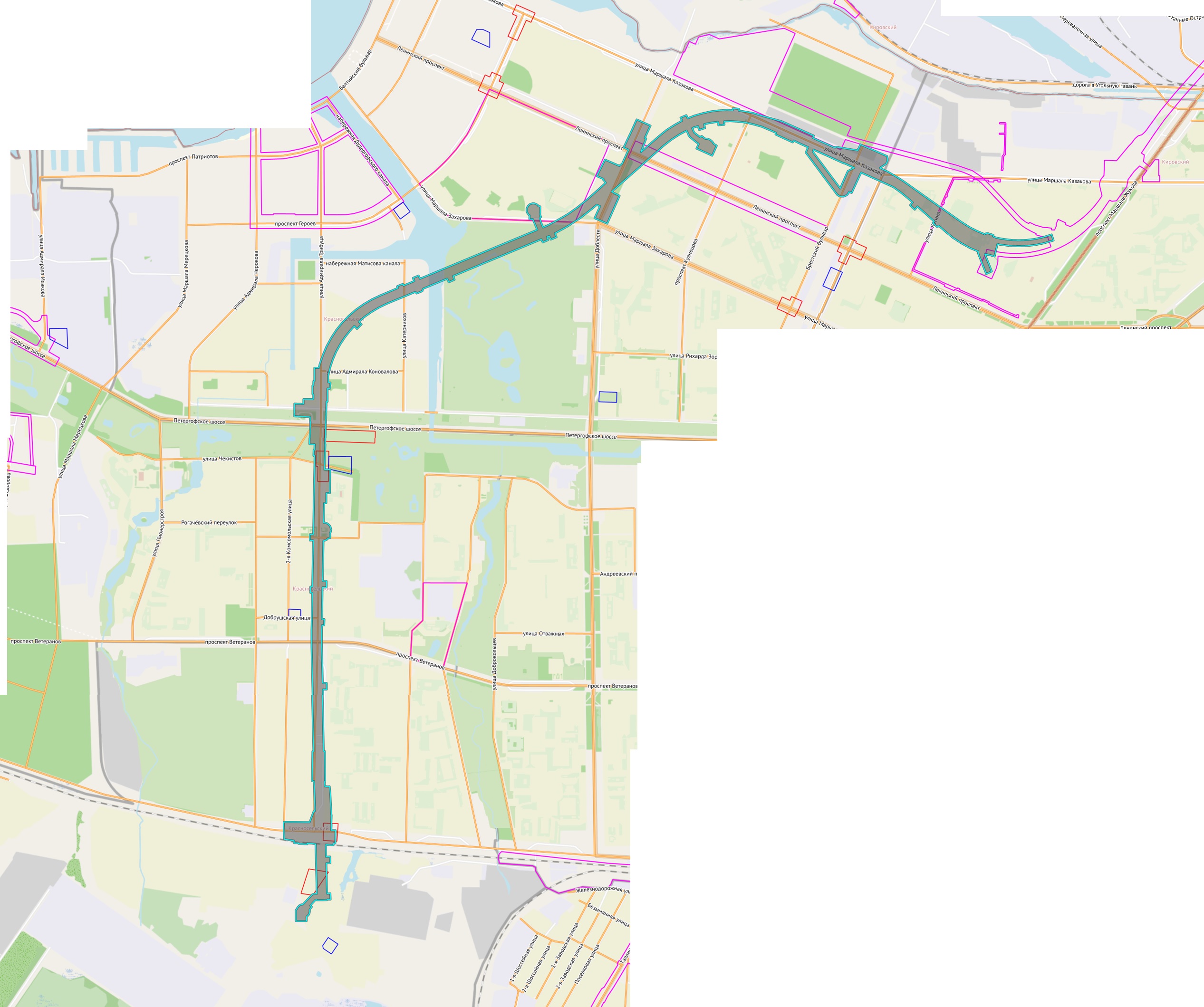 Схема проекта планировки территории с сайта РГИС участка ККЛ от ст. "Казаковская" до ст. "Сосновая Поляна" ("Казаковская" - "Брестская" - "Ул. Доблести" - "Петергофское шоссе" - "Сосновая Поляна"). На схеме, кроме самого участка, обозначены перспективные площадки вестибюлей (контуры обозначены красным) и шахт (синим), зарезервированные еще в 2013 году. Однако, когда резервировали эти участки, еще действовала старая схема развития 2011 года, при которой в Сосновую Поляну приходила АОЛ через ст. "пр. Героев", а ККЛ продлевалась в Стрельну через "Петергофское шоссе". Поэтому, сейчас сравнивать планируемые в 2013 году площадки вестибюлей и шахт с ныне указанными, некорректно.