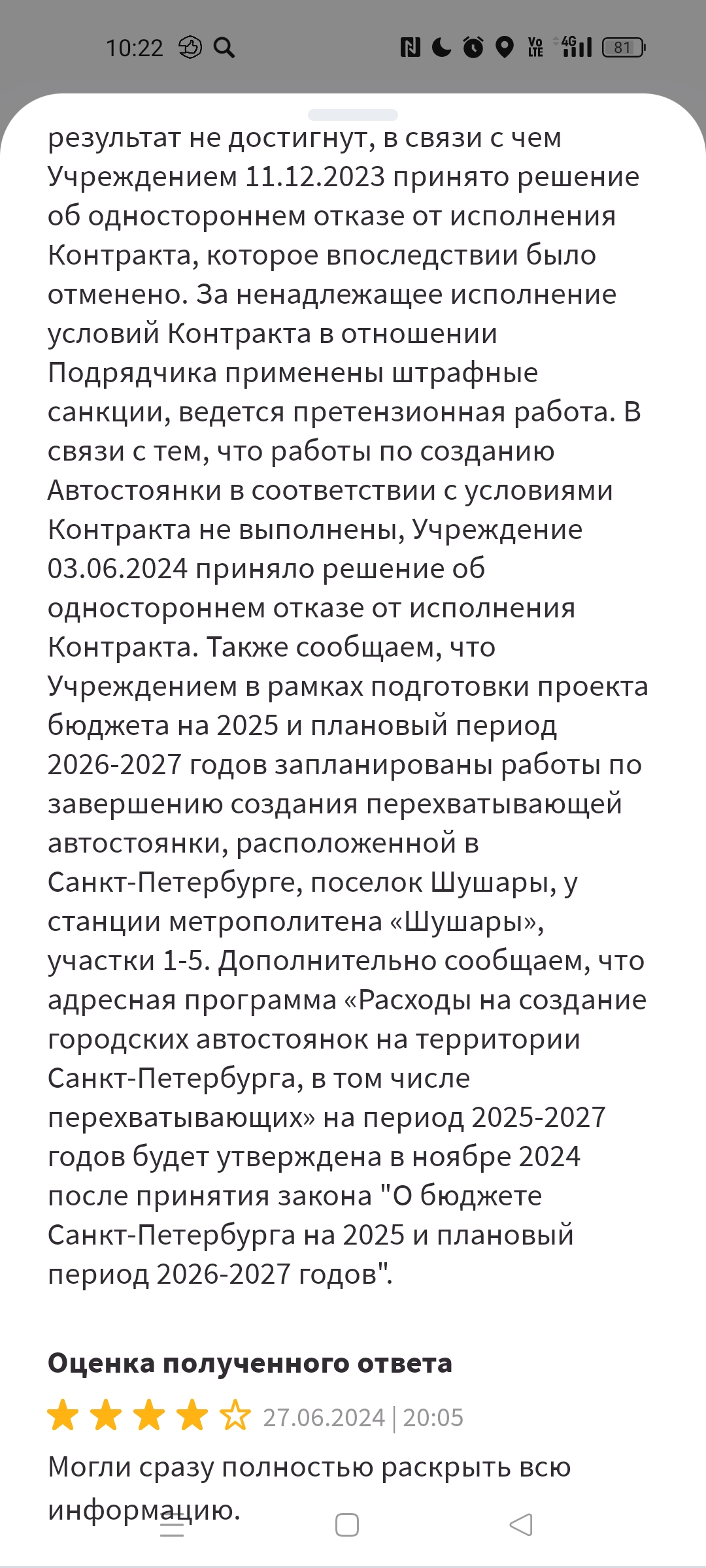 Ответ ведомства по поводу прекращения строительства перехватывающей стоянки у метро Шушары.