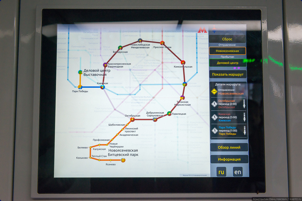 А вот схему проезда экран показывает не самую короткую. В этом мы можем убедиться по данному снимку. Например на заданном маршруте показана схема проезда от Новоясеневской до ДЦ. Проще на Октябрьской до Киевской, а не ехать почти всё кольцо.