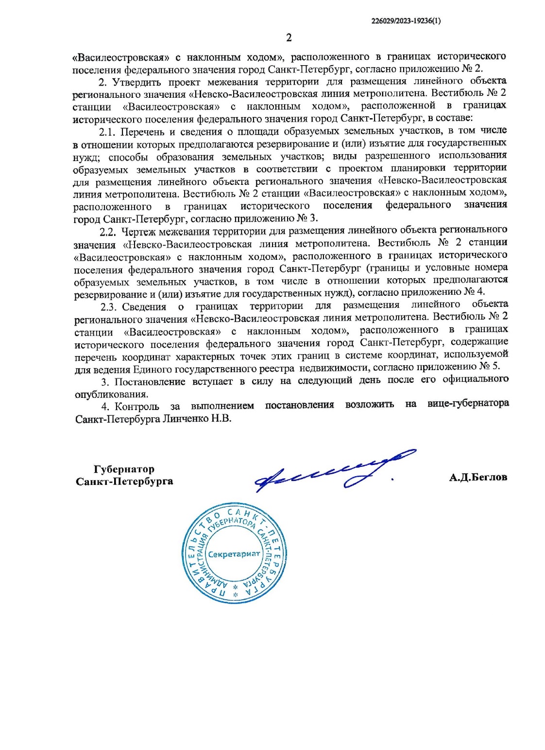 Проект планировки планировки территории для размещения вестибюля № 2 станции "Василеостровская" с наклонным ходом, утвержден постановлением Правительства Санкт-Петербурга от 21.12.2023 № 1391.