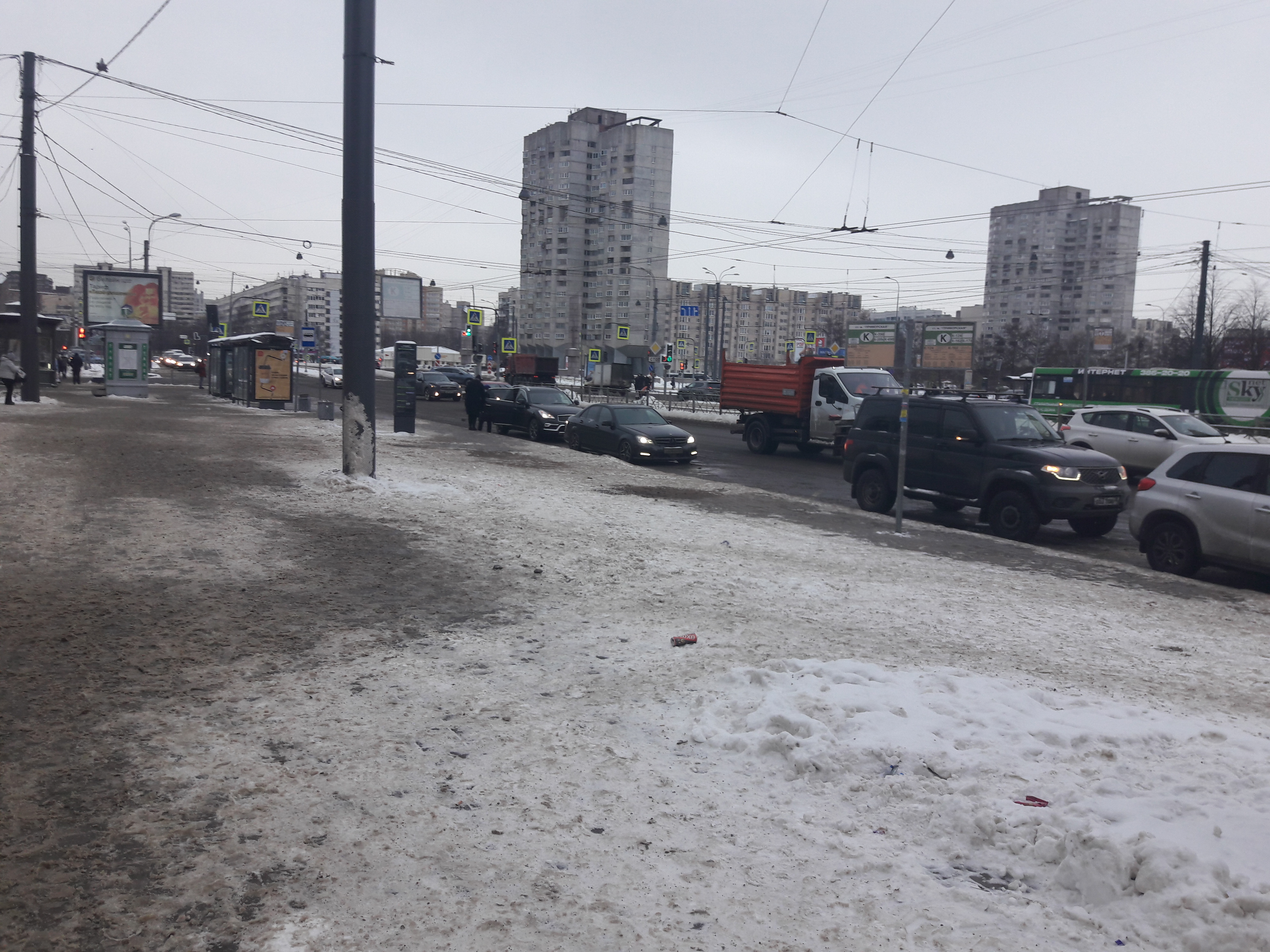 И пару фоток. На Бухарестской. Народ на посадку в автобус вытоптал тропинку. И на противополоджной стороне тягач вытаскивал автобус, который намертво застрял в снежной каше, которую и не думали своевременно расчищать.