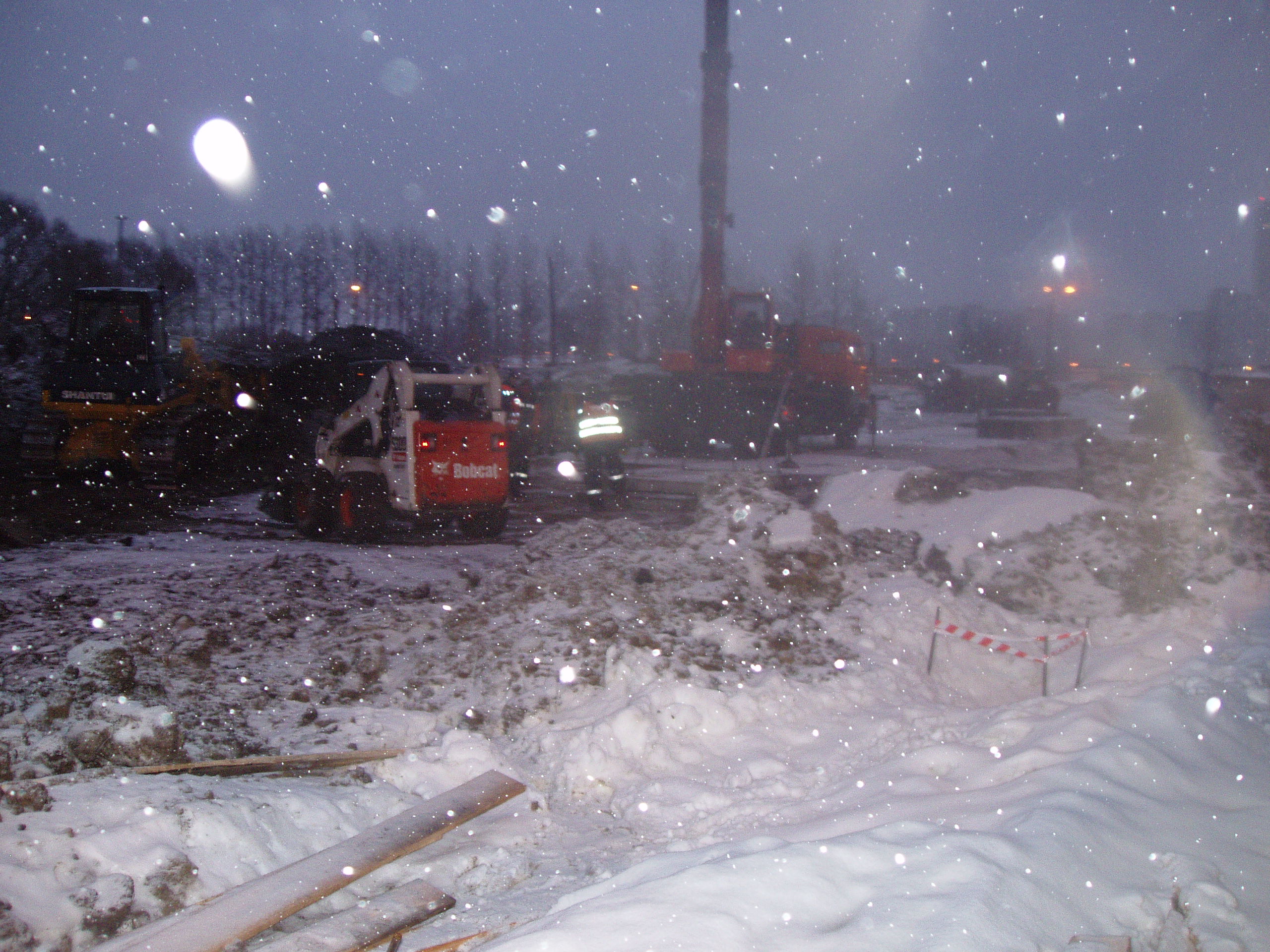 Оживленное место. Работало человек 10-12, расчищали площадку, укладывали бетонные плиты, ограждение тоже еще не закончили. Техники на площадке побольше (6-8 ед.). Бытовки уже обжитые, работает дизель. Т.е. электричесство пока не подведено.