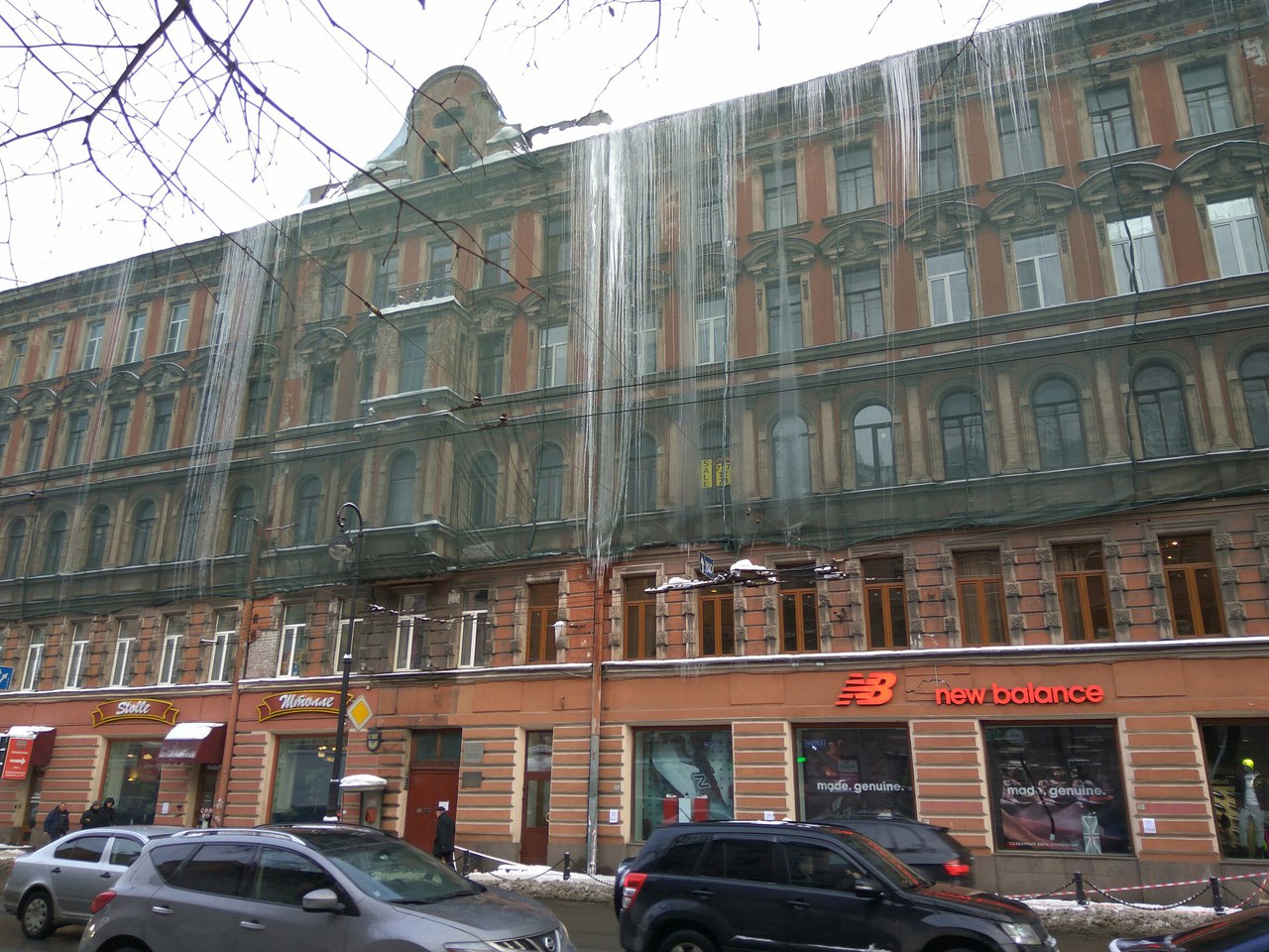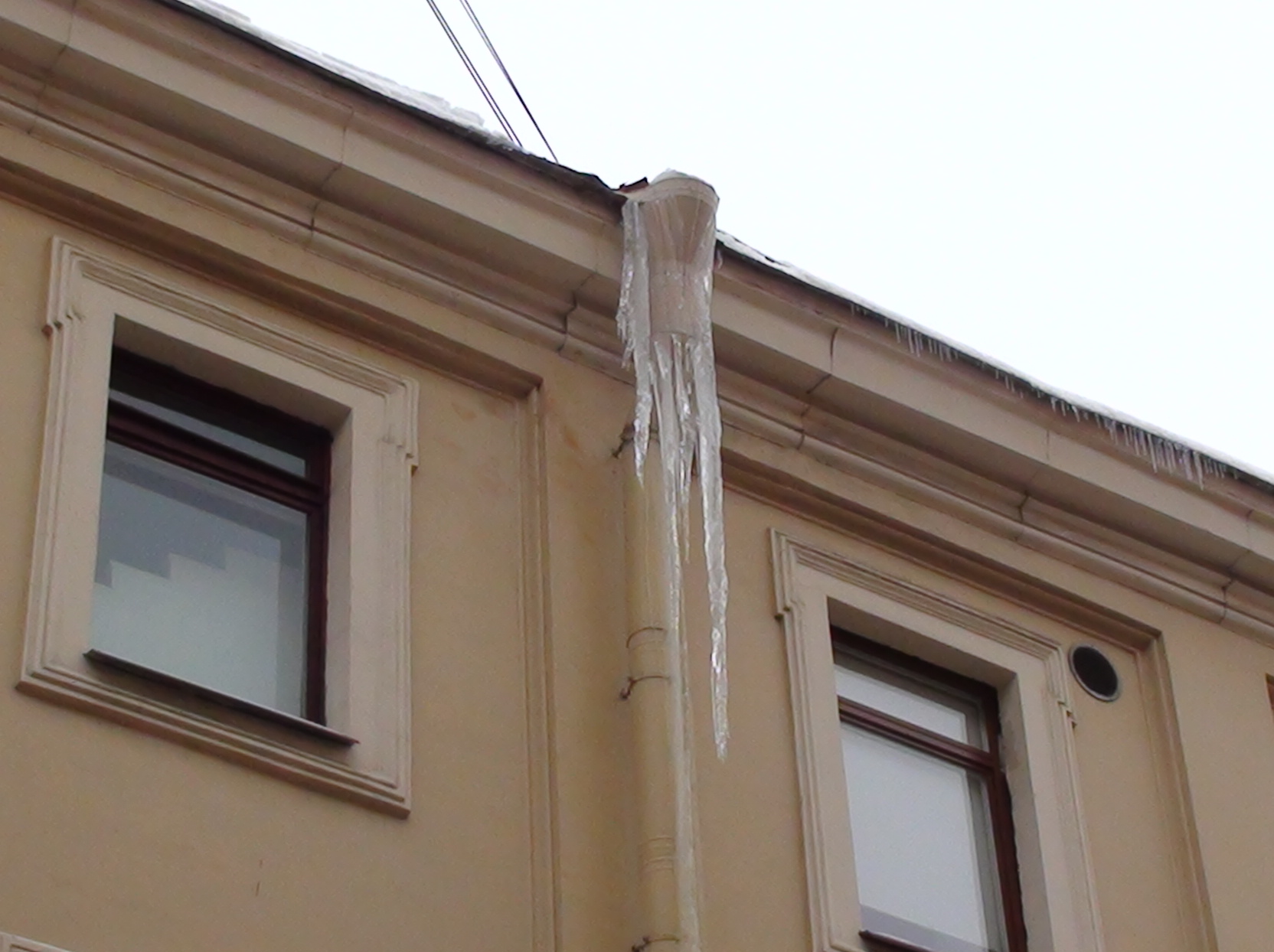 Забавно смотрятся застывший водопад из "сосуль". В любой момент это может рухнуть...на людей. Вся наледь может за собой потянуть всю сетку и возможно часть металлических листов с крыши.
